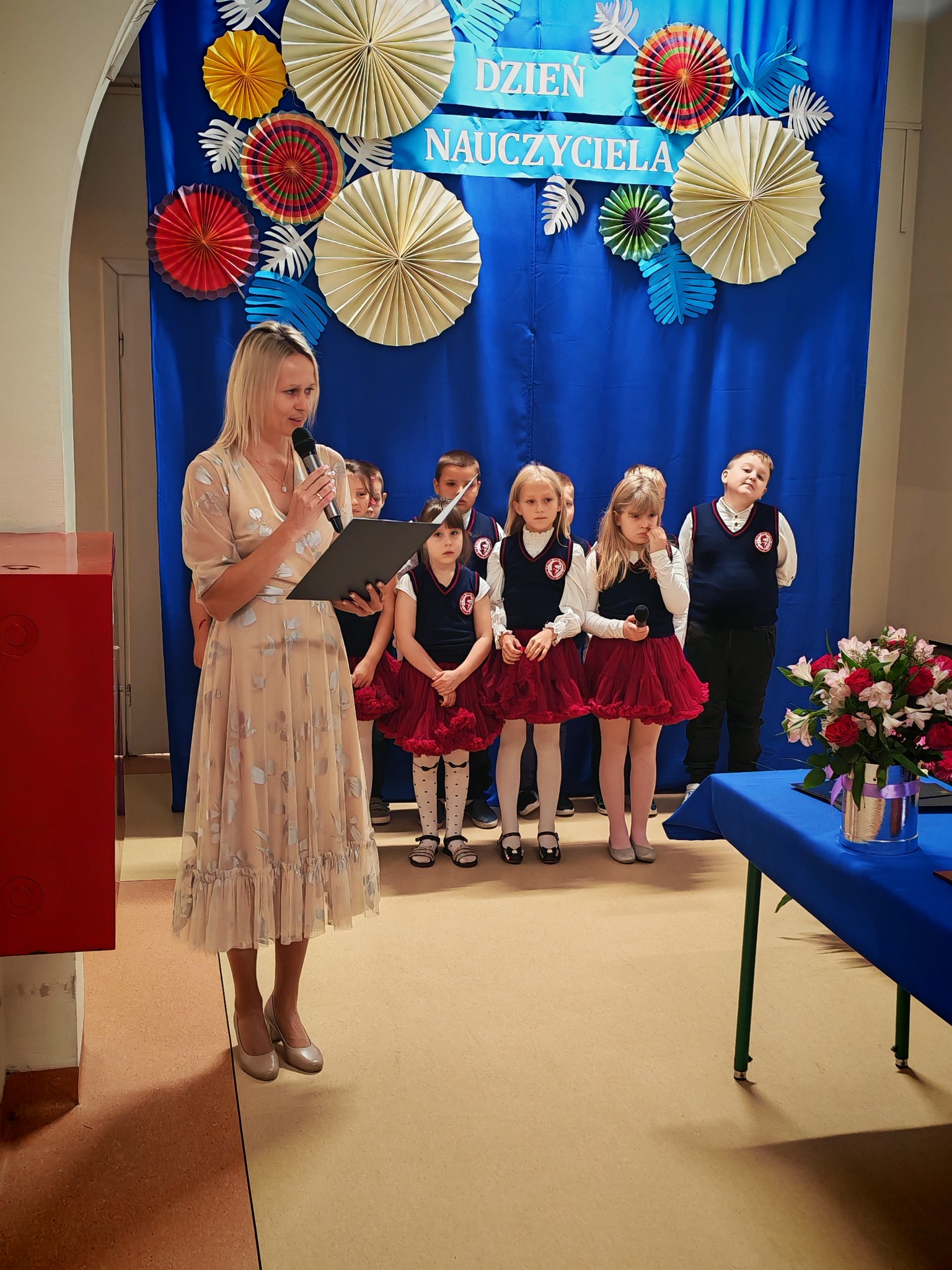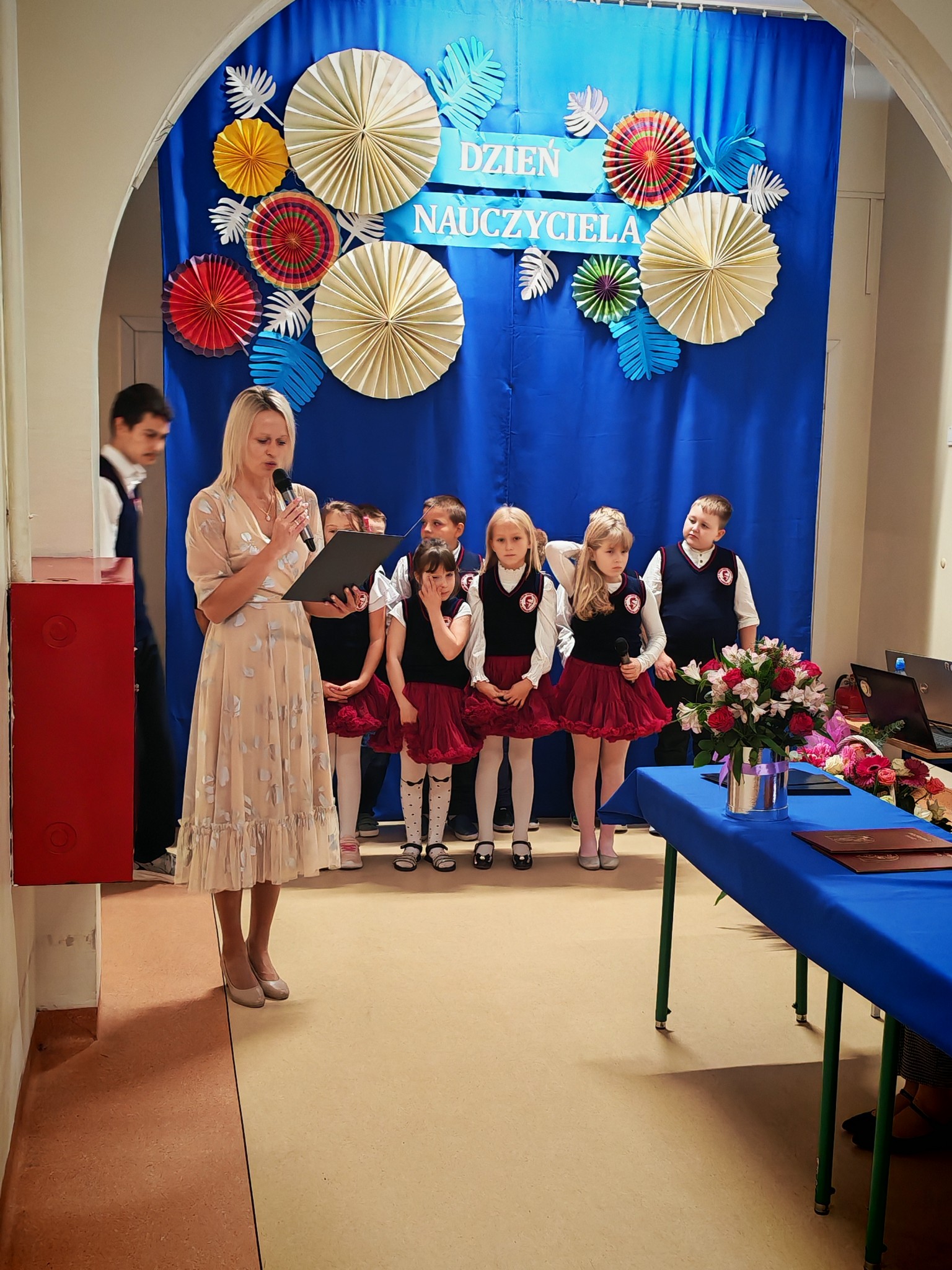 Uroczystość rozpoczęła Pani Dyrektor Patrycja Dziuba, która serdecznie powitała wszystkich gości, w tym Panią Izabellę Kierasińską – Sekretarz Gminy Gniewoszów, Księdza Proboszcza Artura Piaska, a także wszystkich nauczycieli, pracowników szkoły oraz uczniów.