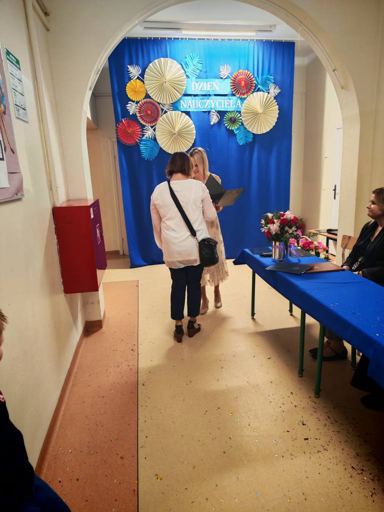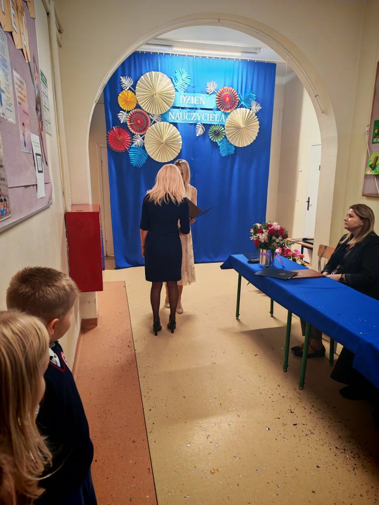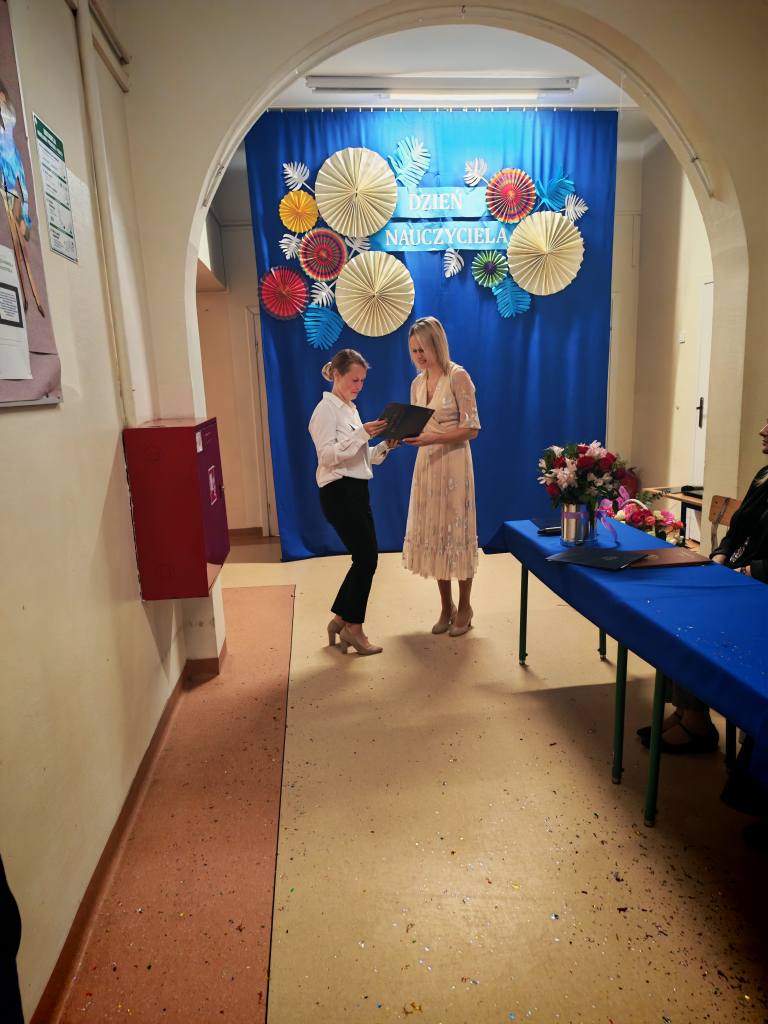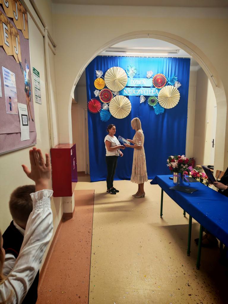 Po akademii Pani Dyrektor wręczyła Nagrody Dyrektora nauczycielom i pracownikom szkoły. Sama również otrzymała wyróżnienie, które przekazała jej Pani Izabella Kierasińska, reprezentująca Wójta Gminy Gniewoszów – Pana Marcina Szymona Gaca.