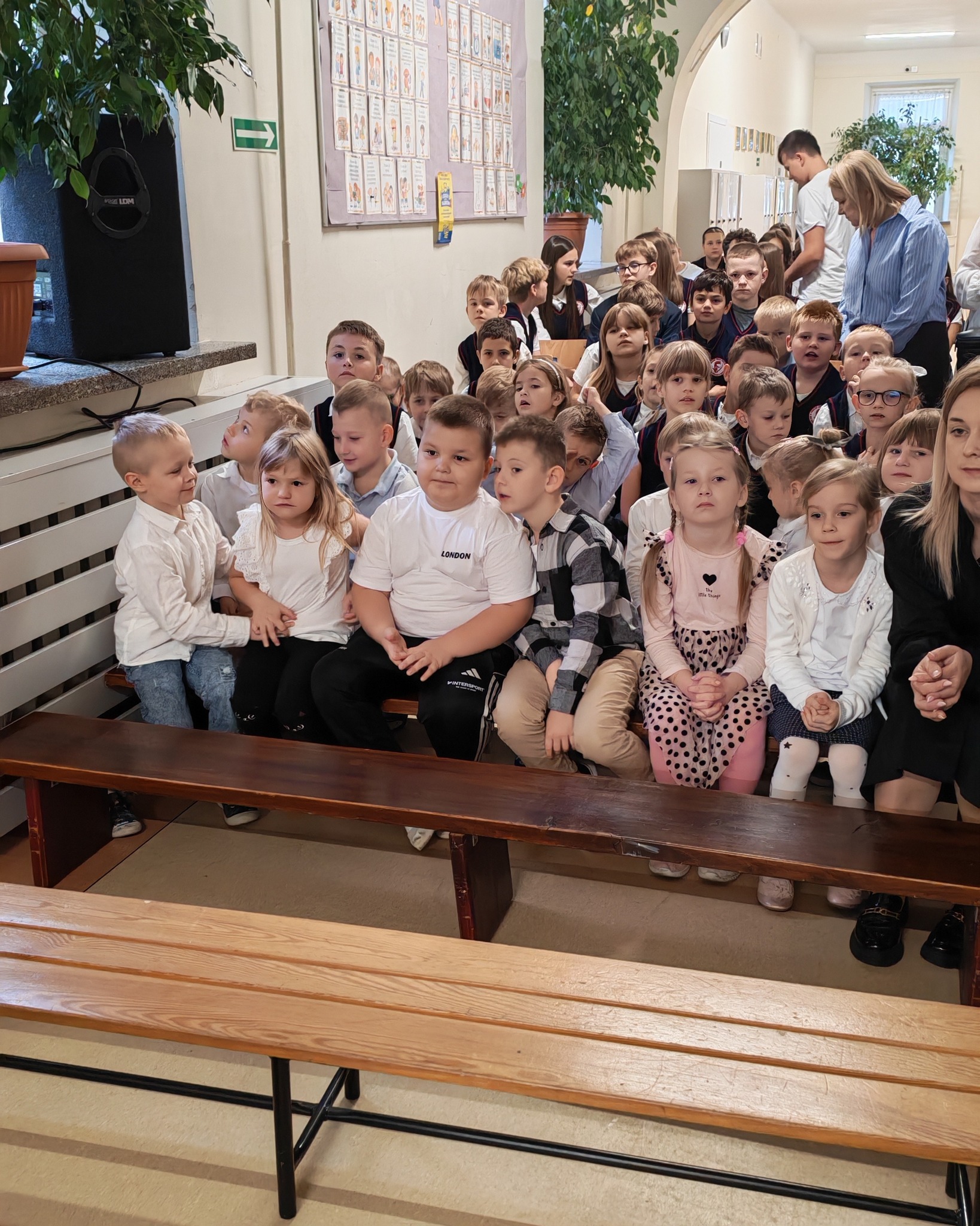 Pani Dyrektor zaprosiła następnie do obejrzenia przygotowanej akademii. Na początek klasa 2 zaśpiewała piękną piosenkę, wprowadzając wszystkich w radosny nastrój .