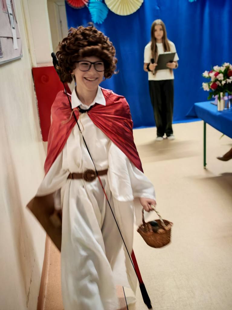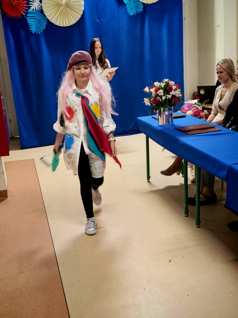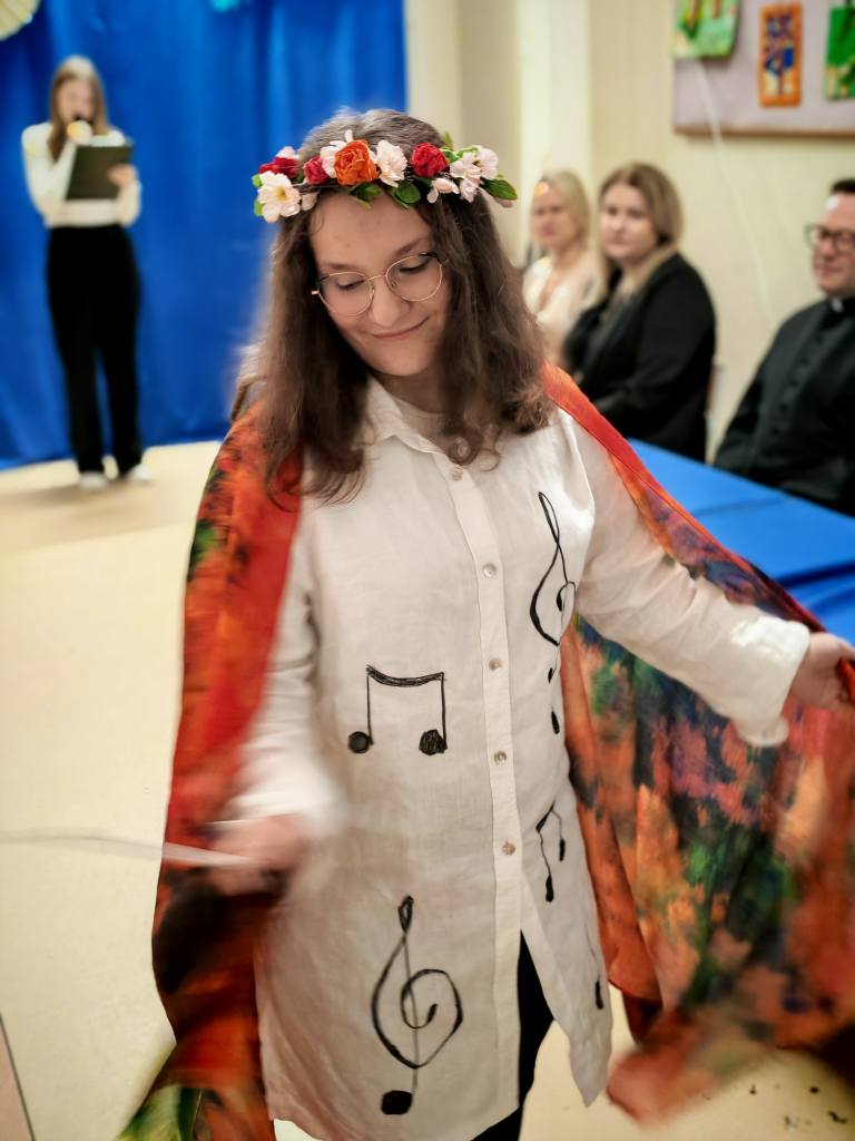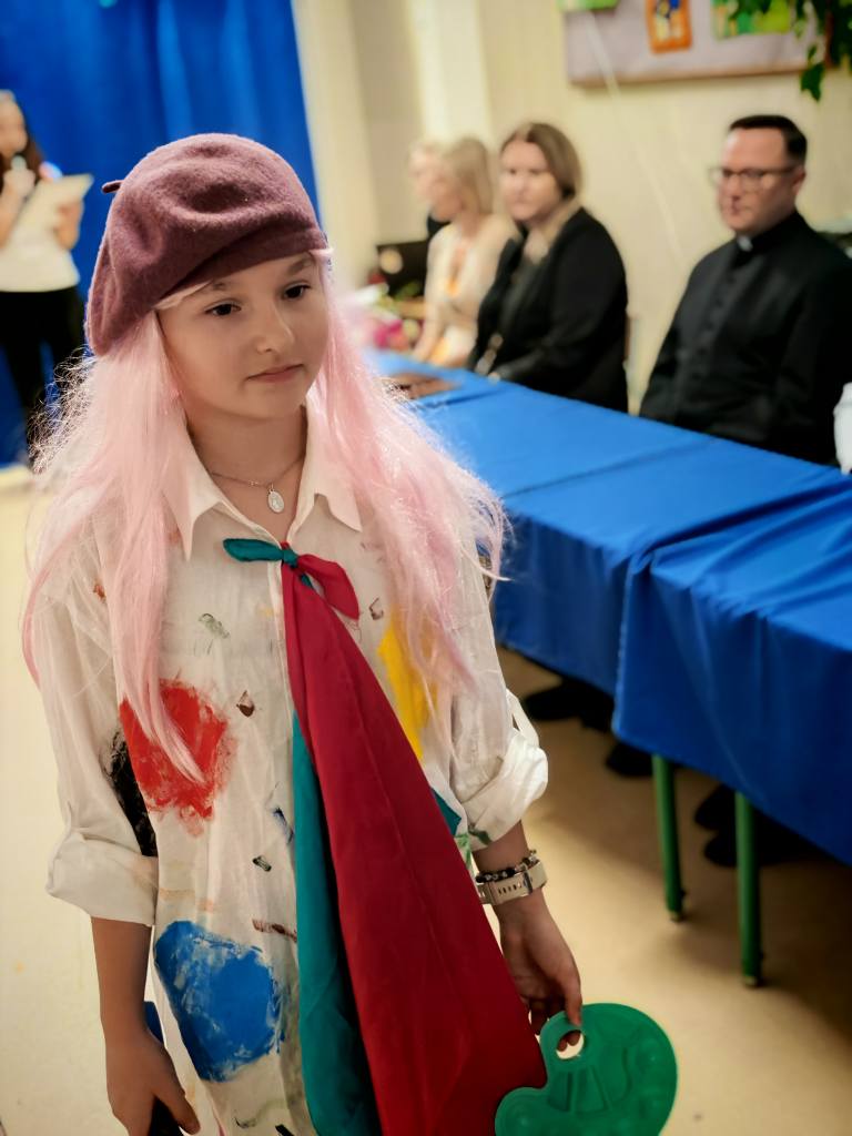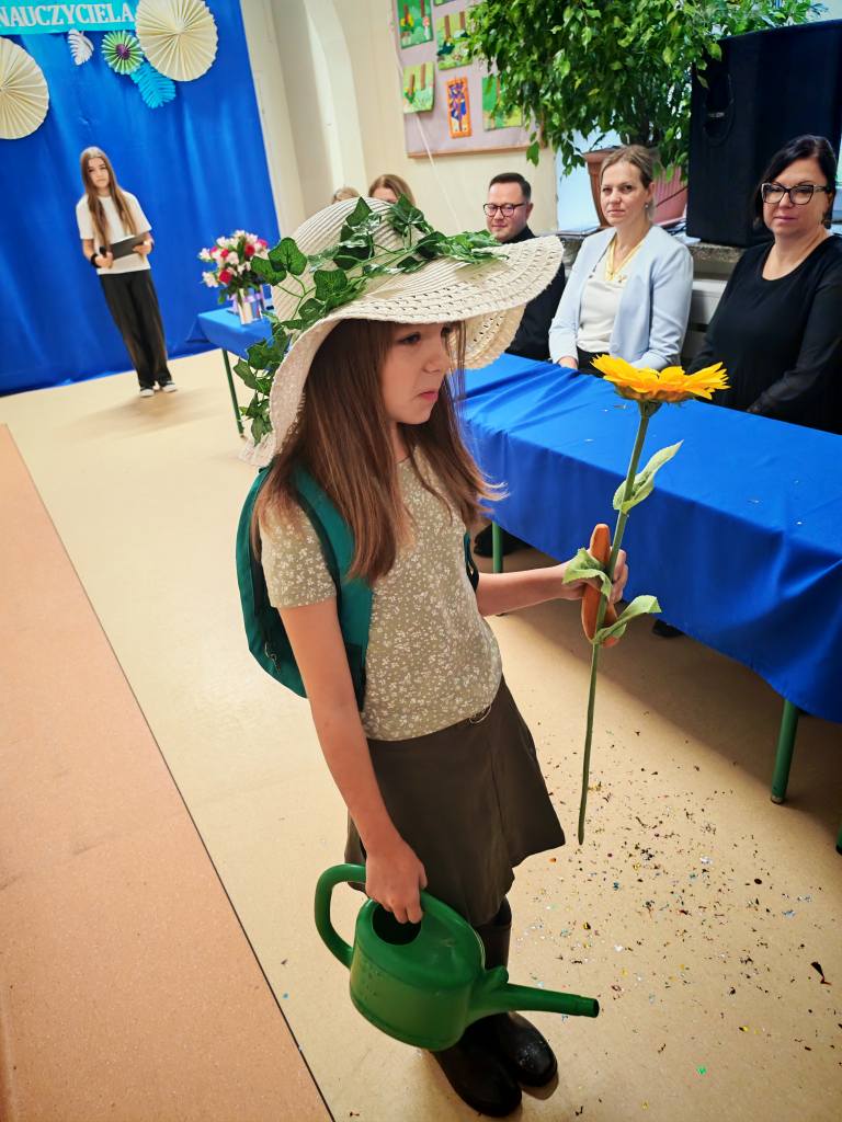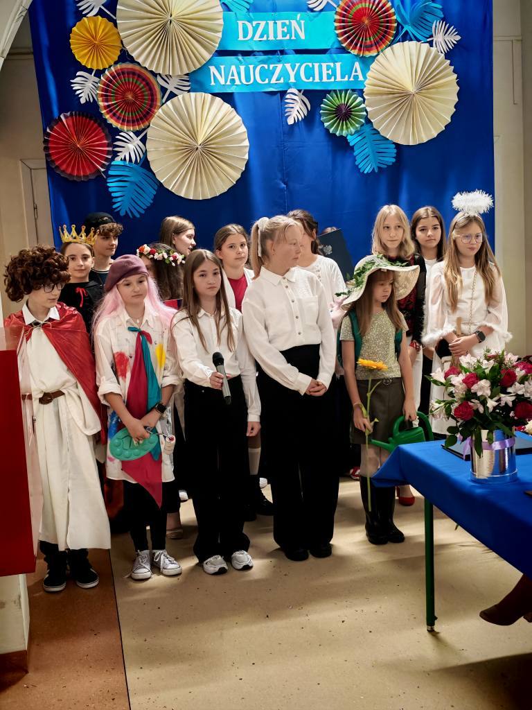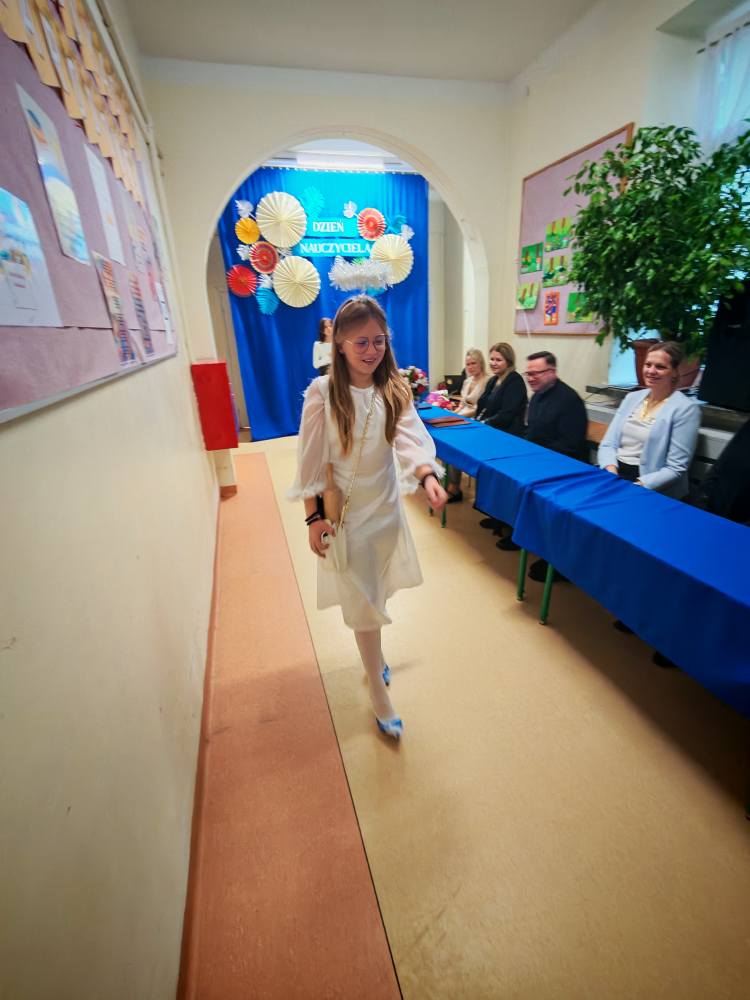 Potem klasy 5, 6, 7 i 8 pod opieką Pani Marty Dymińskiej zaprezentowały w humorystyczny sposób szkolną codzienność – uczniowie wcielili się w nauczycieli, odwzorowując ich charakterystyczne stroje i zachowania. Było mnóstwo śmiechu i świetnej zabawy!