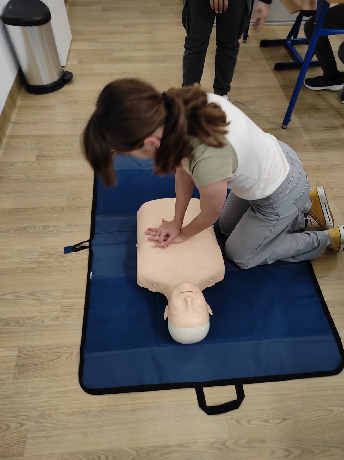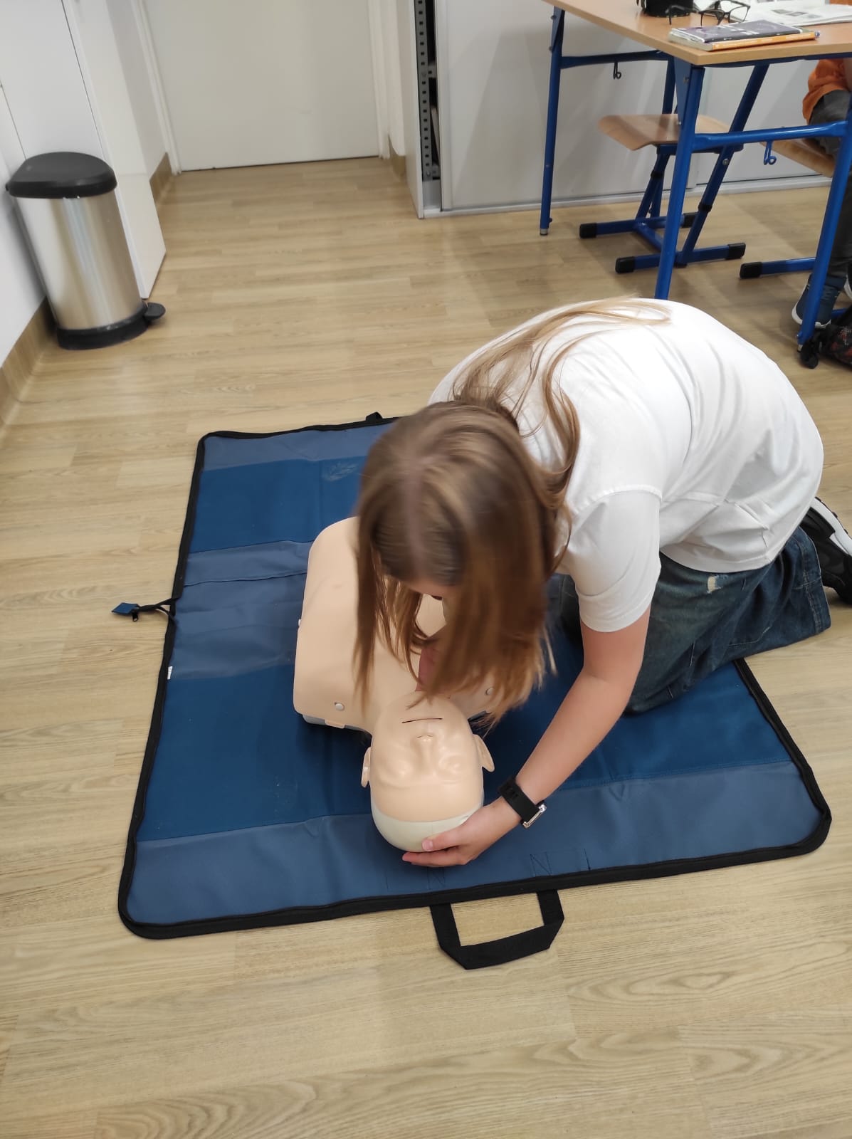 Pani Elżbieta opowiedziała, jak należy się zachować, gdy ktoś potrzebuje pomocy. Pokazała, jak sprawdzić, czy osoba poszkodowana oddycha, jak zadzwonić po pogotowie i co powiedzieć dyspozytorowi. Młodzież uczyła się jak ułożyć kogoś w pozycji bocznej bezpiecznej i co zrobić, jeśli ktoś się zakrztusi.