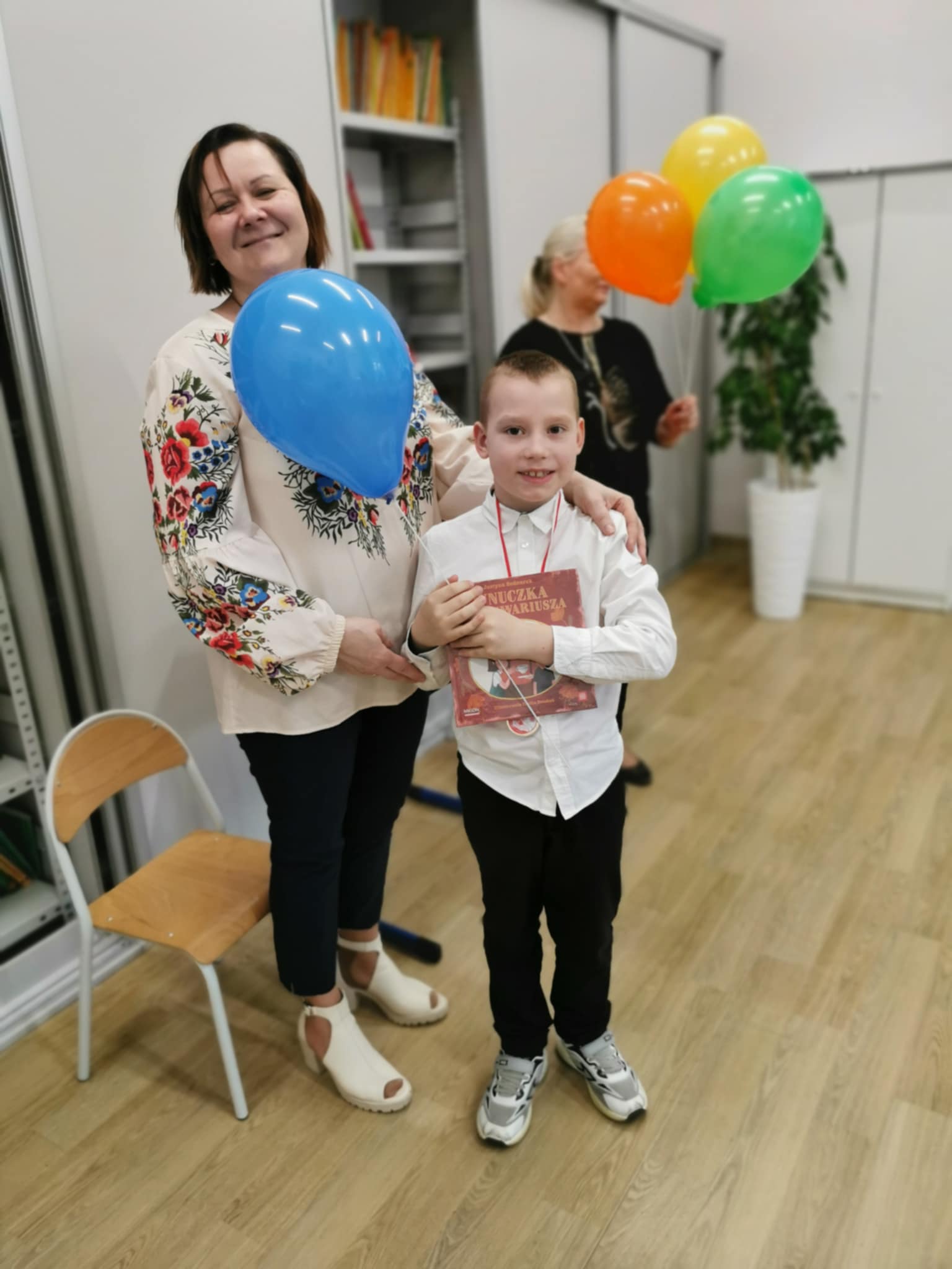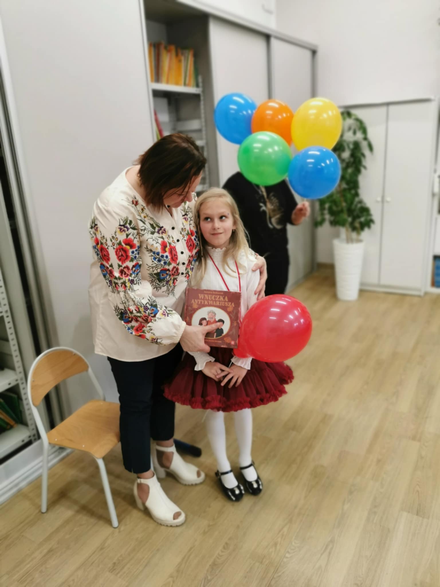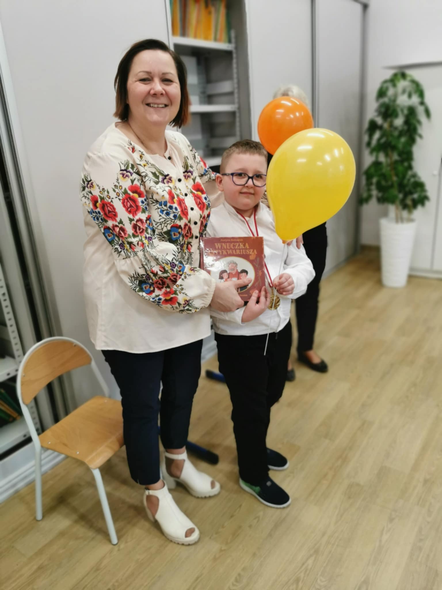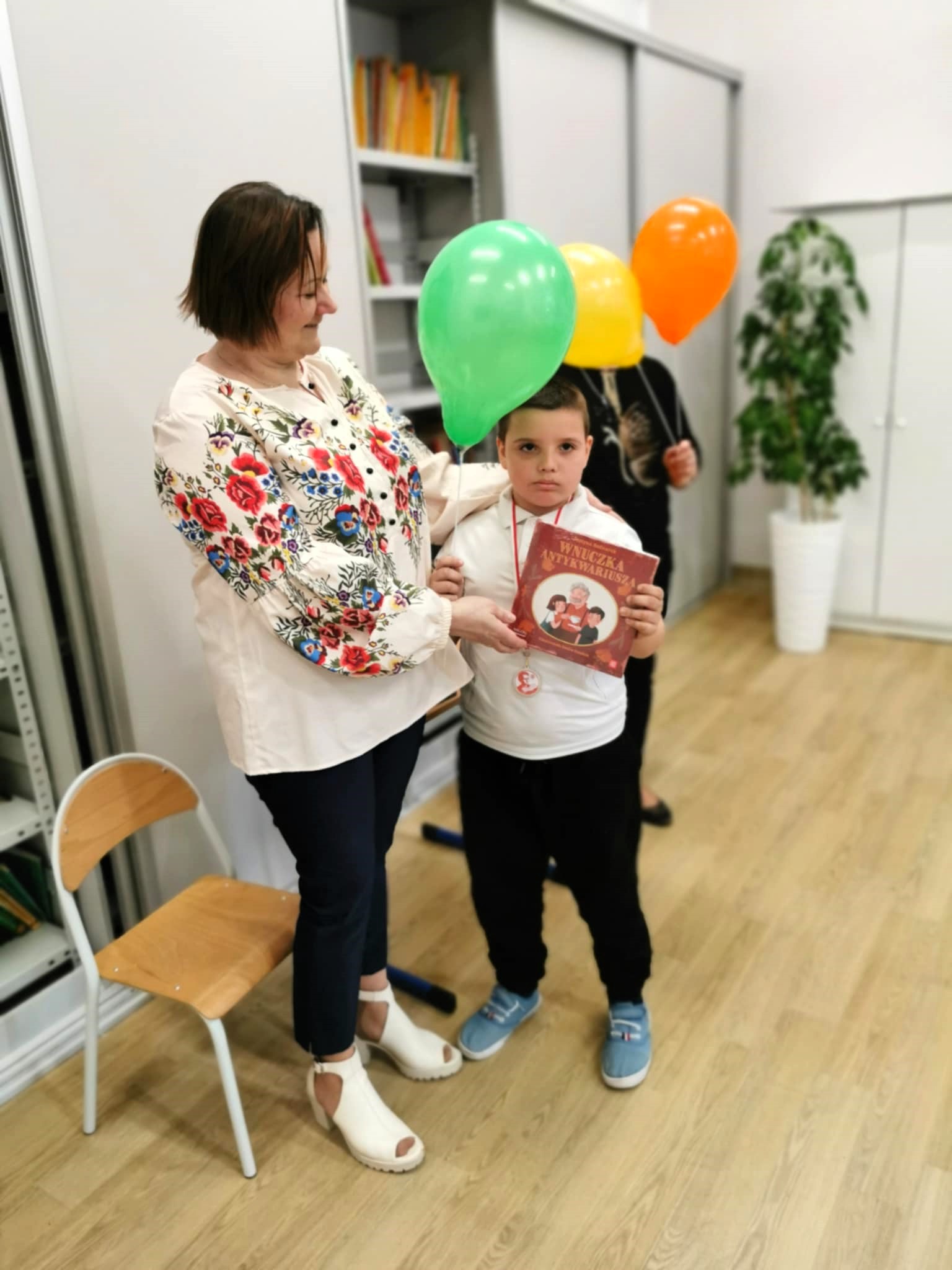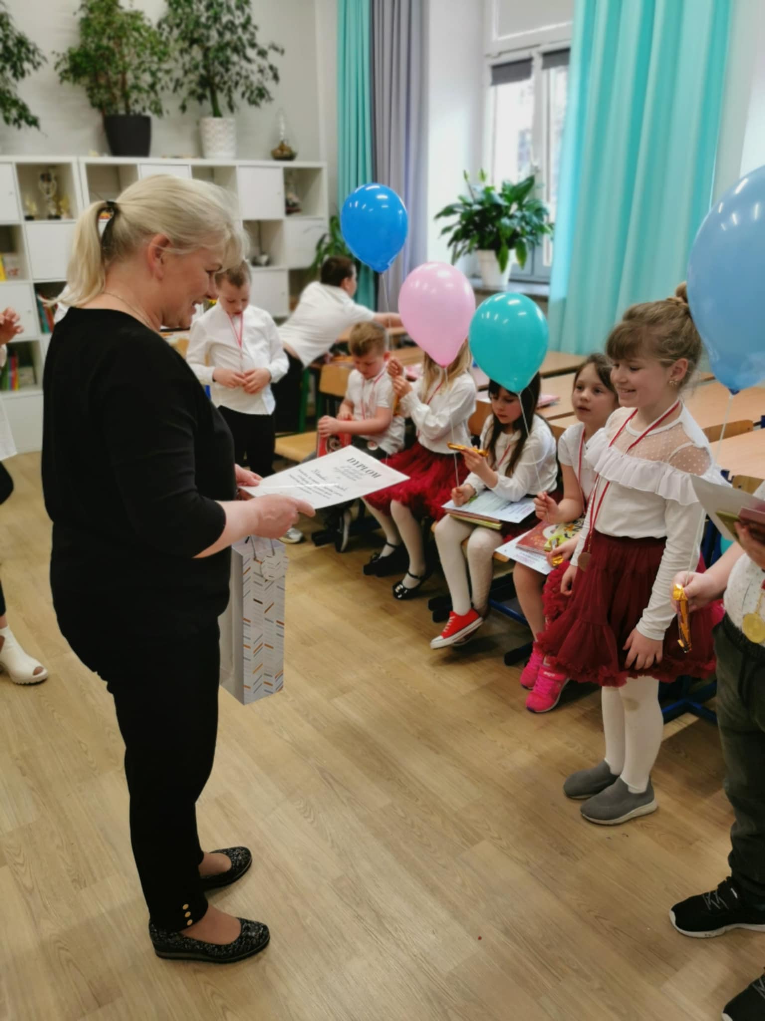 Nie zabrakło również symbolicznych upominków – każde dziecko otrzymało dyplom, książkę, słodkości, kolorowy balon oraz pamiątkowy medal z wizerunkiem naszej Patronki – Marii Skłodowskiej-Curie.