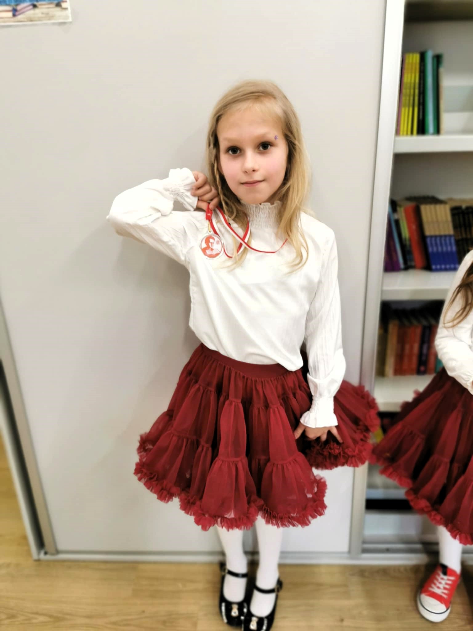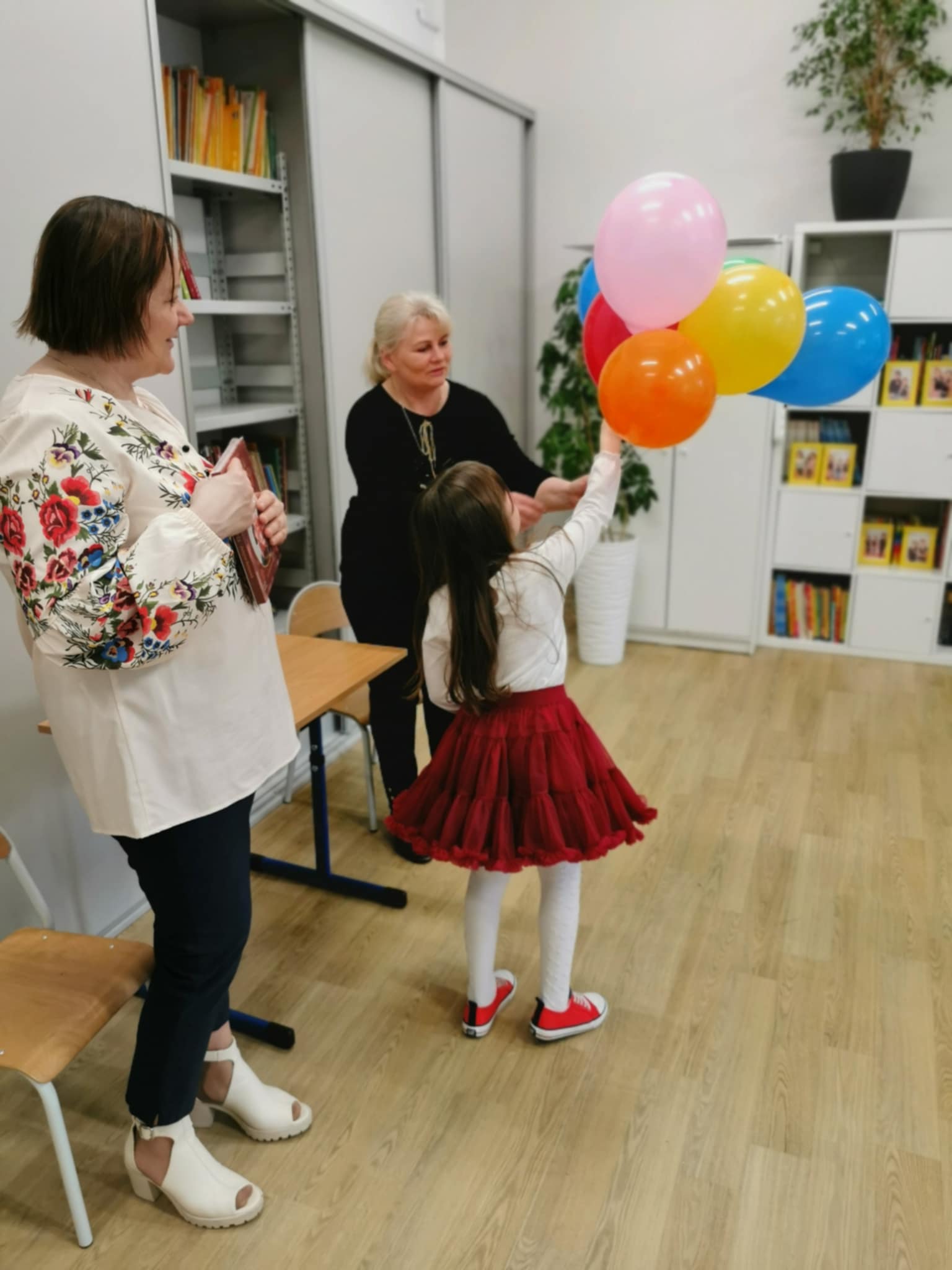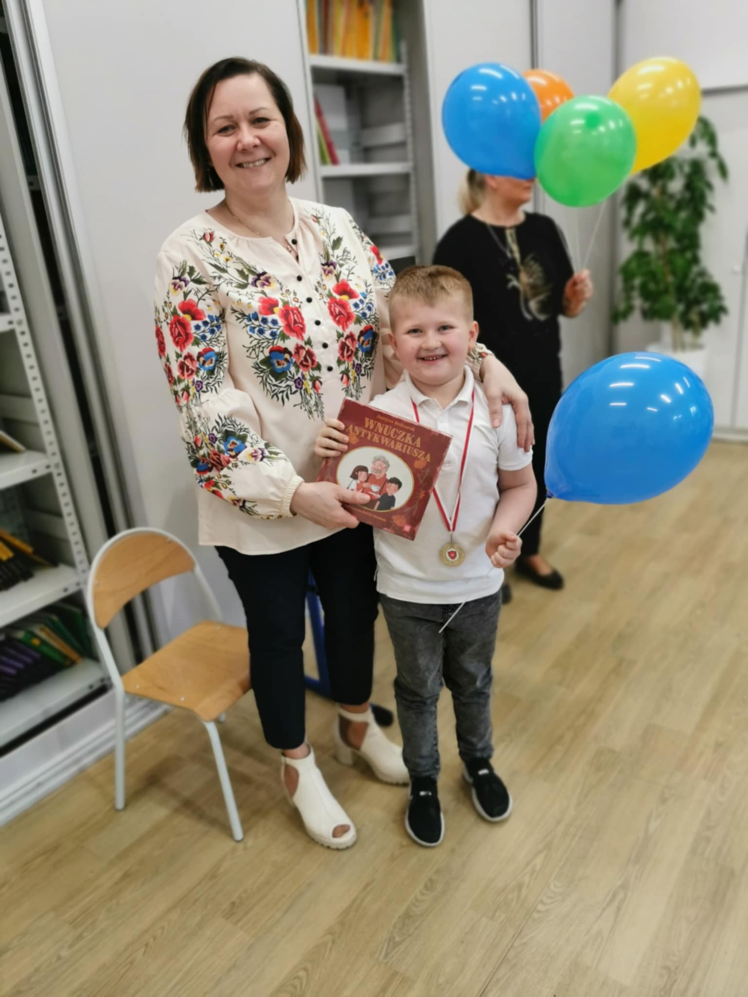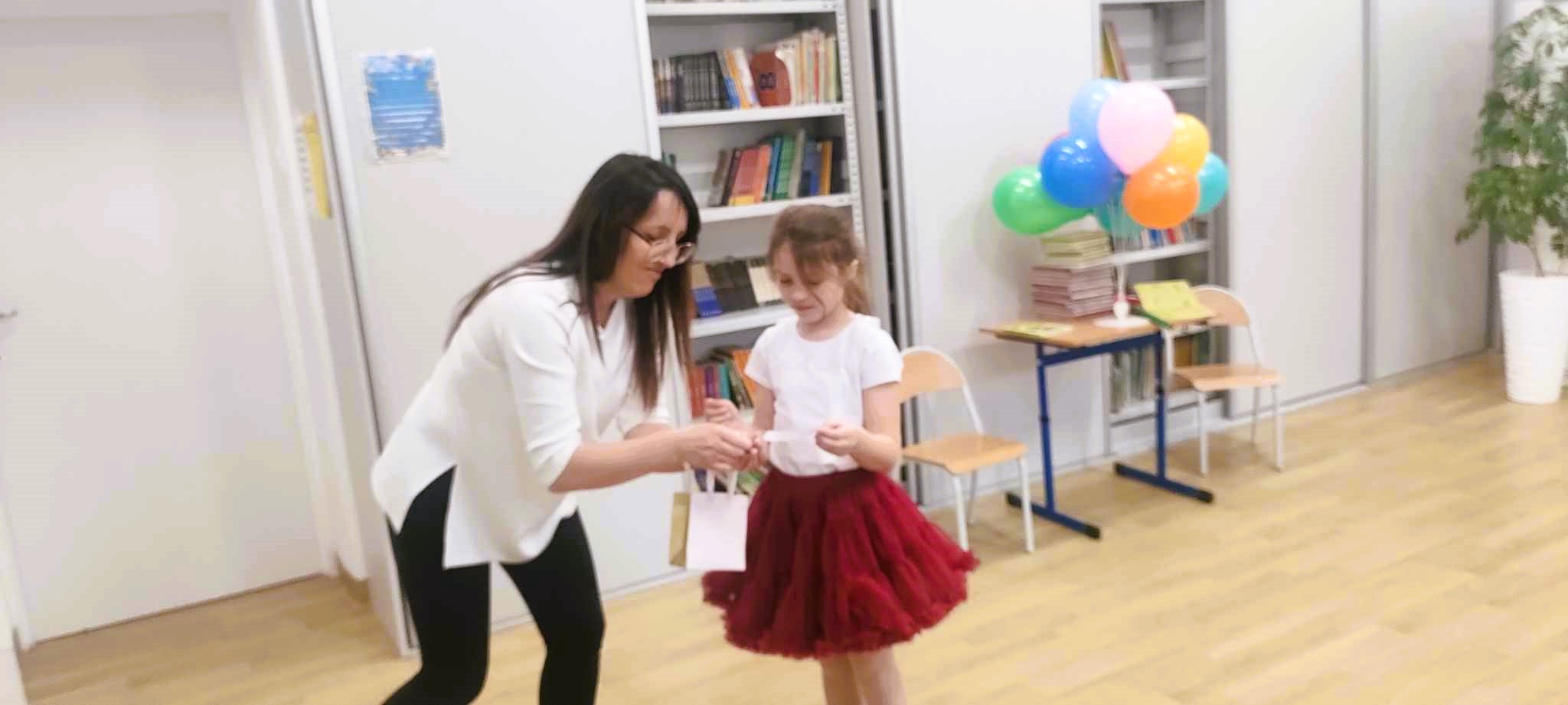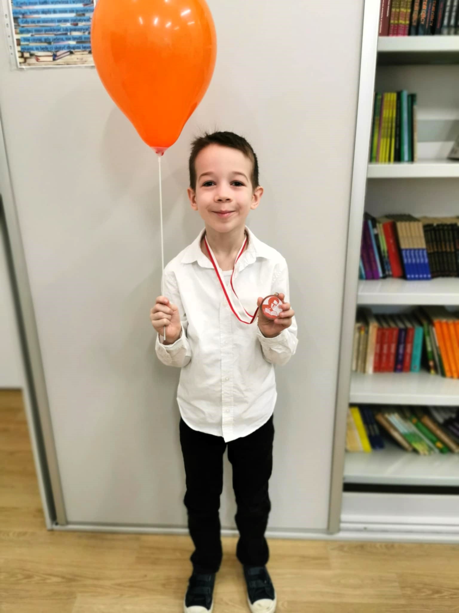 Nie zabrakło również symbolicznych upominków – każde dziecko otrzymało dyplom, książkę, słodkości, kolorowy balon oraz pamiątkowy medal z wizerunkiem naszej Patronki – Marii Skłodowskiej-Curie.