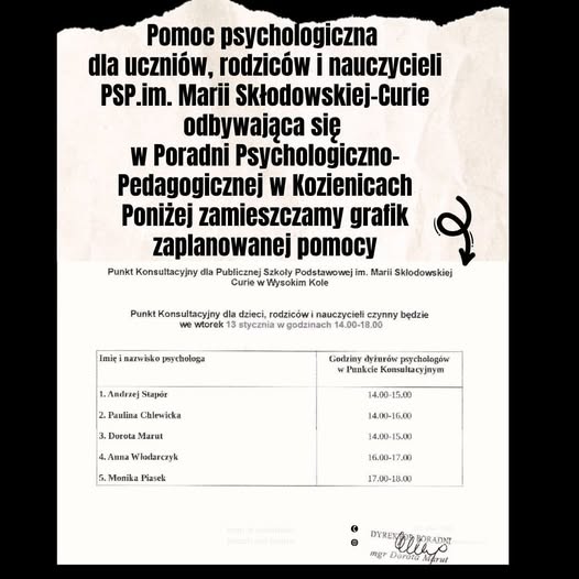 Może być zdjęciem przedstawiającym tekst „Pomoc psychologiczna psychol dla uczniów, rodziców i nauczycieli PSP. PSP.im. .im. Marii Skłodowskiej-Curie odbywająca się W Poradni Psychologiczno- Pedagogicznej w Kozienicach Poniżej zamieszczamy grafik zaplanowanej pomocy Punkt Konsultacyjny dla Publiczne Szkoły Podstawowe im. Marii Skłodowskiej Wysokim Punkt Konsultacyjny dla dzieci, rodziców nauczycieli czynny będzie wtorek 13 stycznia w godzinach 14.00-18.00 Imię nazwisk isko psychologa 1. Andrzej Stapor Godziny λγeπτό sychalogów w Punkcie Konsulwcyjnym 2. Paulina Chlewicka 3. Dorota Marut 14.00-15.00 14.00 15.00 .Anna Włodarczyk 14.00-16.00 5. Monika Piasek 14.00 15.00 16.00-17.00 17.00-18.00 holplsovallablo Roochouttodov DYREXODPRRAPR mgr DorotaMaru Dorota Mprut”