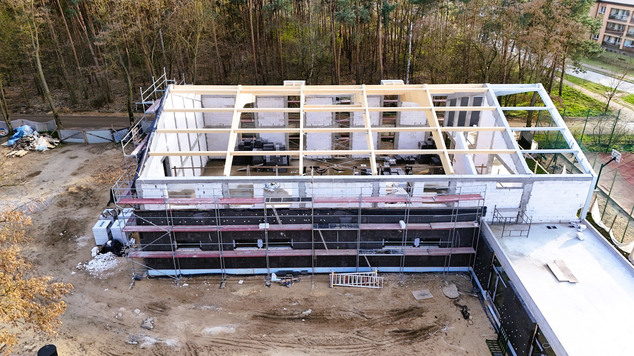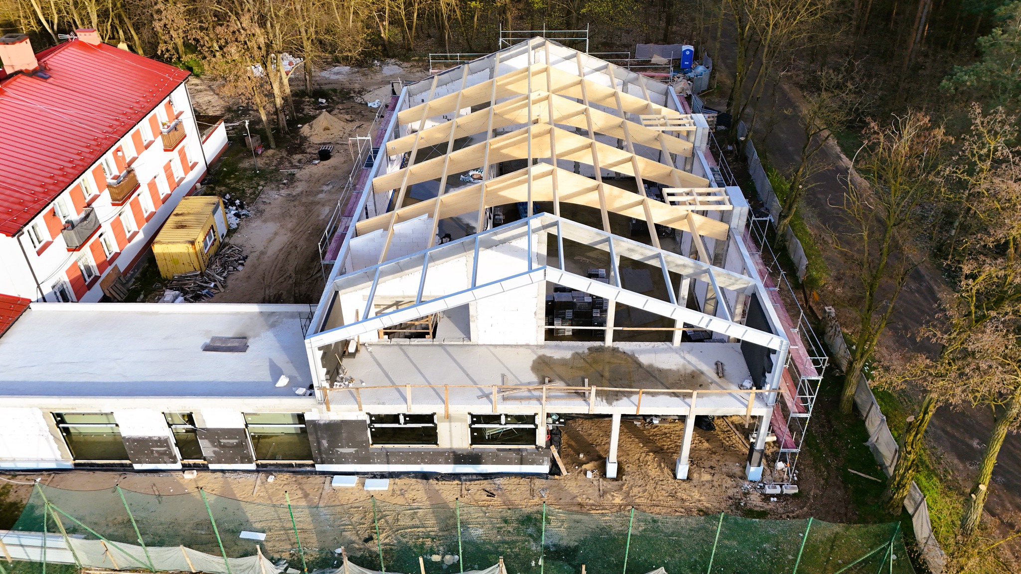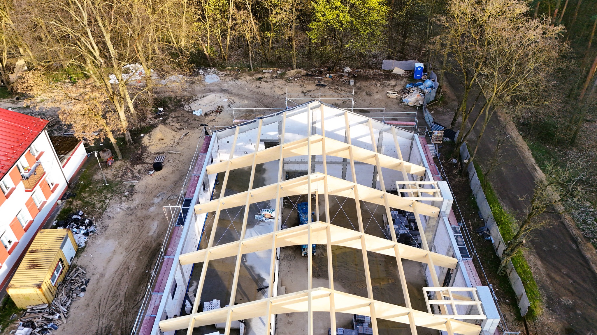 Z radością dzielimy się kolejnym ważnym etapem prac – zakończono montaż drewnianej konstrukcji dachu!