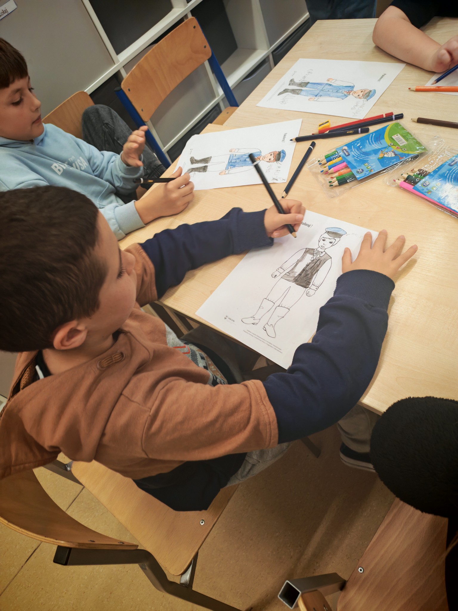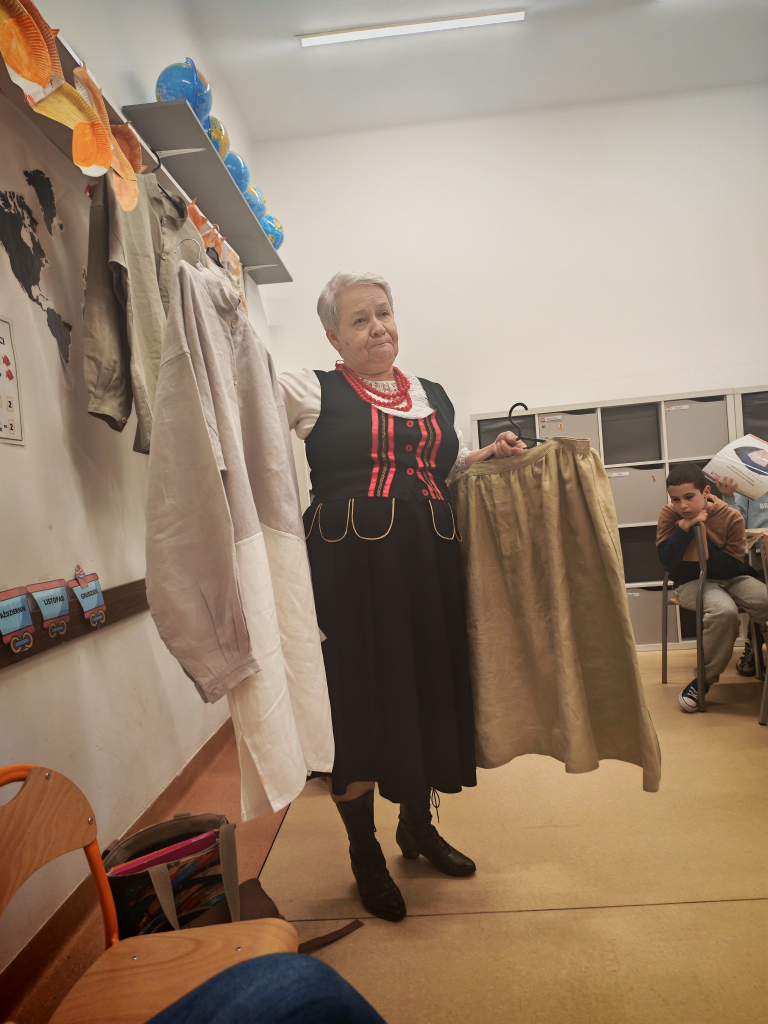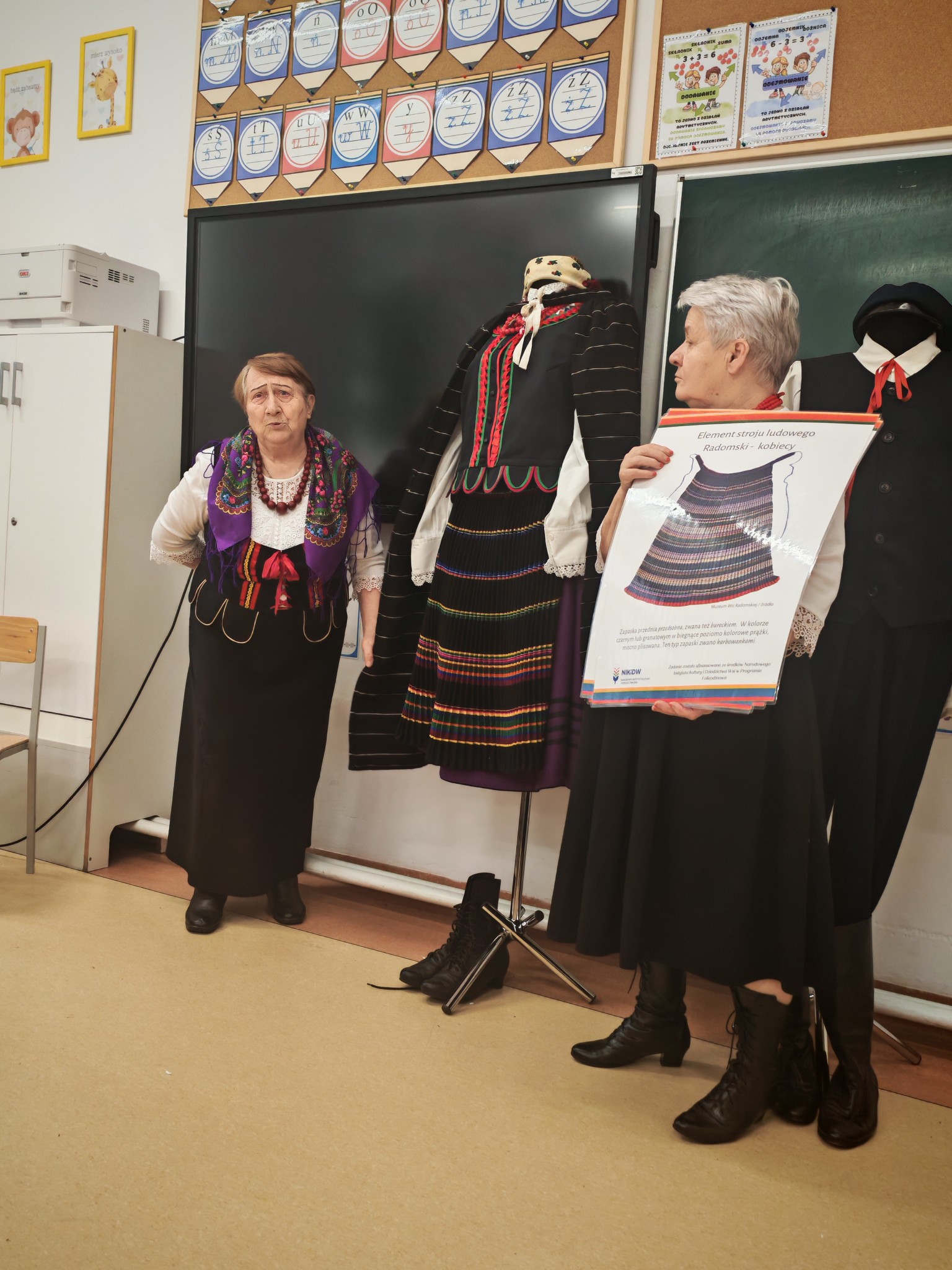 Uczniowie klasy drugiej oraz trzeciej poznali tradycyjne stroje ludowe ziemi radomskiej oraz ciekawostki o dawnych zwyczajach i kulturze naszego regionu.