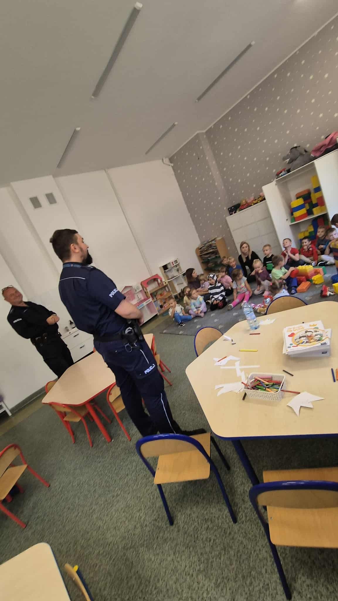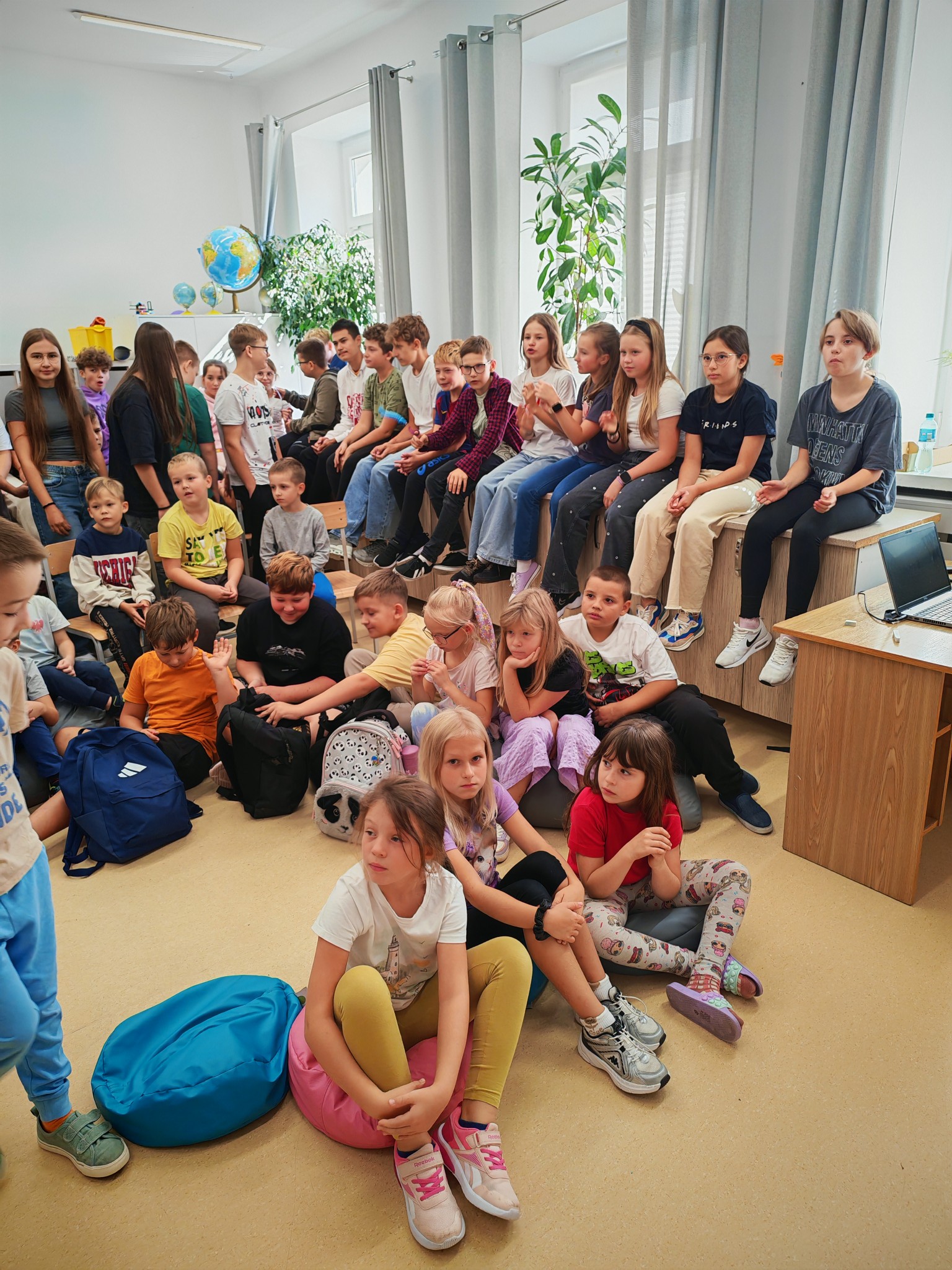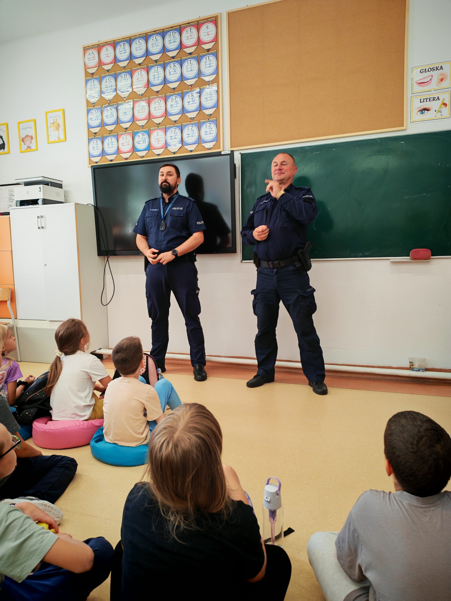 Uczniowie wzięli udział w pogadance na temat bezpiecznej drogi do szkoły. Funkcjonariusze przypomnieli zasady prawidłowego poruszania się po ulicy, dbania o bezpieczeństwo w drodze do szkoły i ze szkoły, a także bezpiecznego korzystania z hulajnóg.