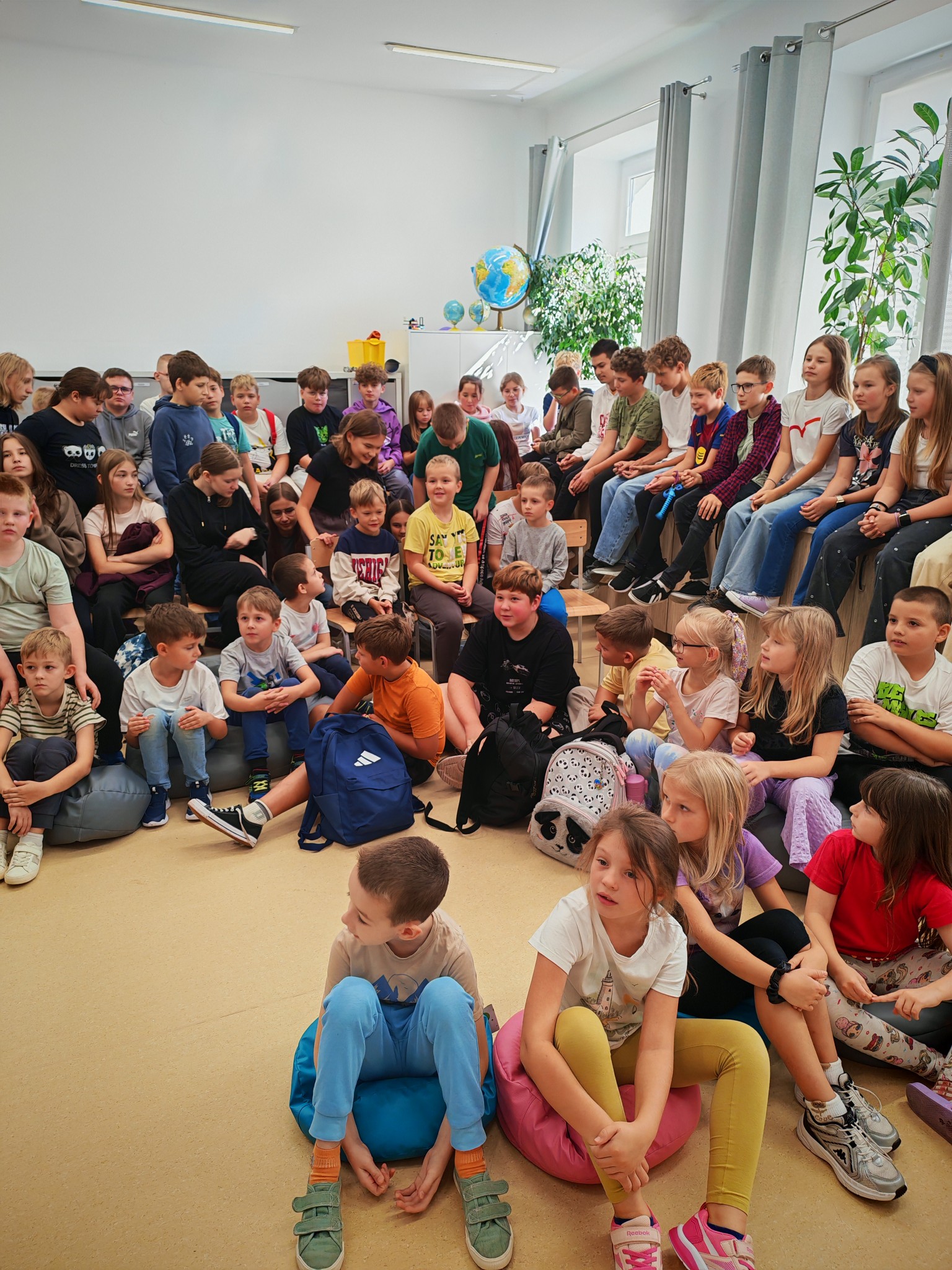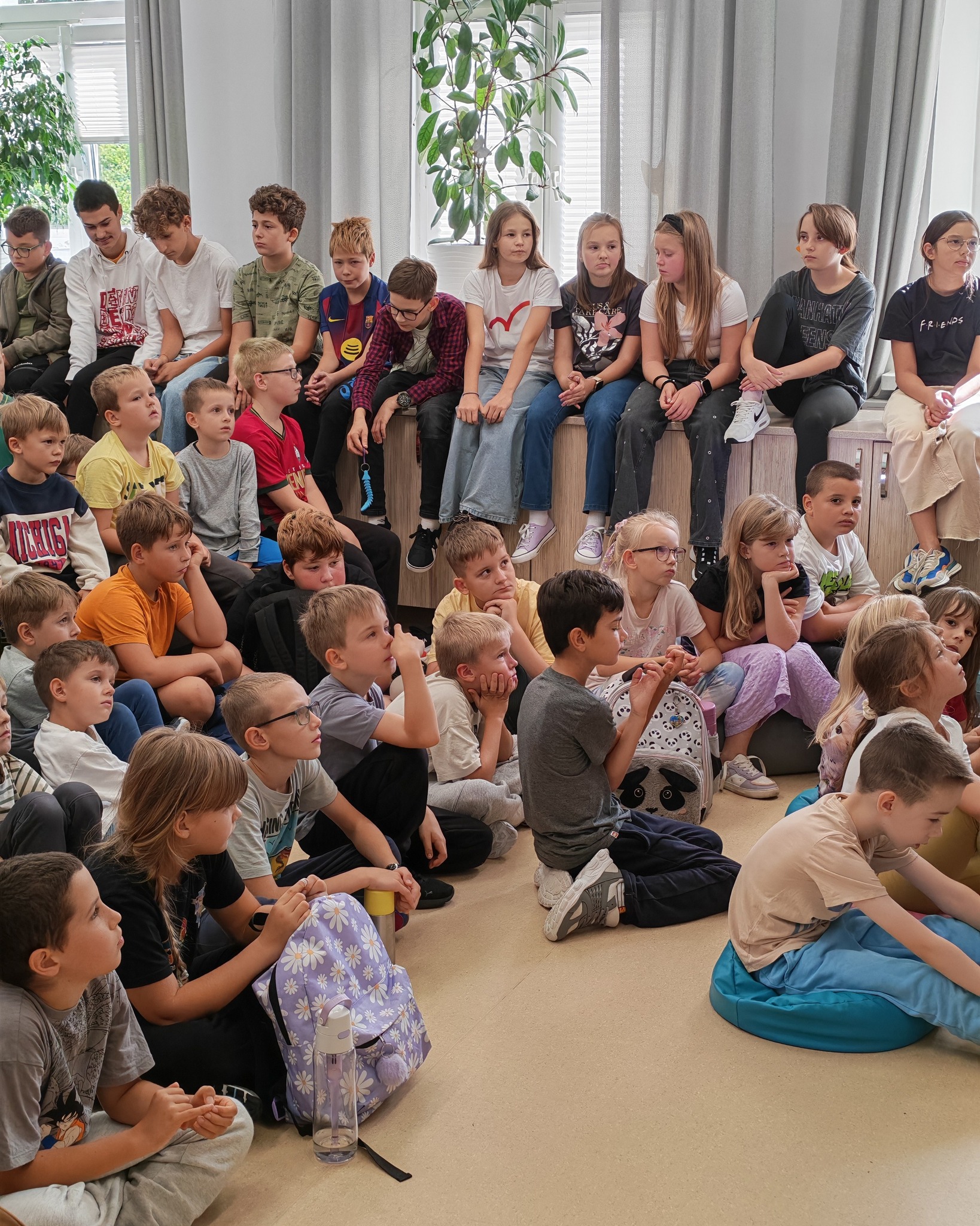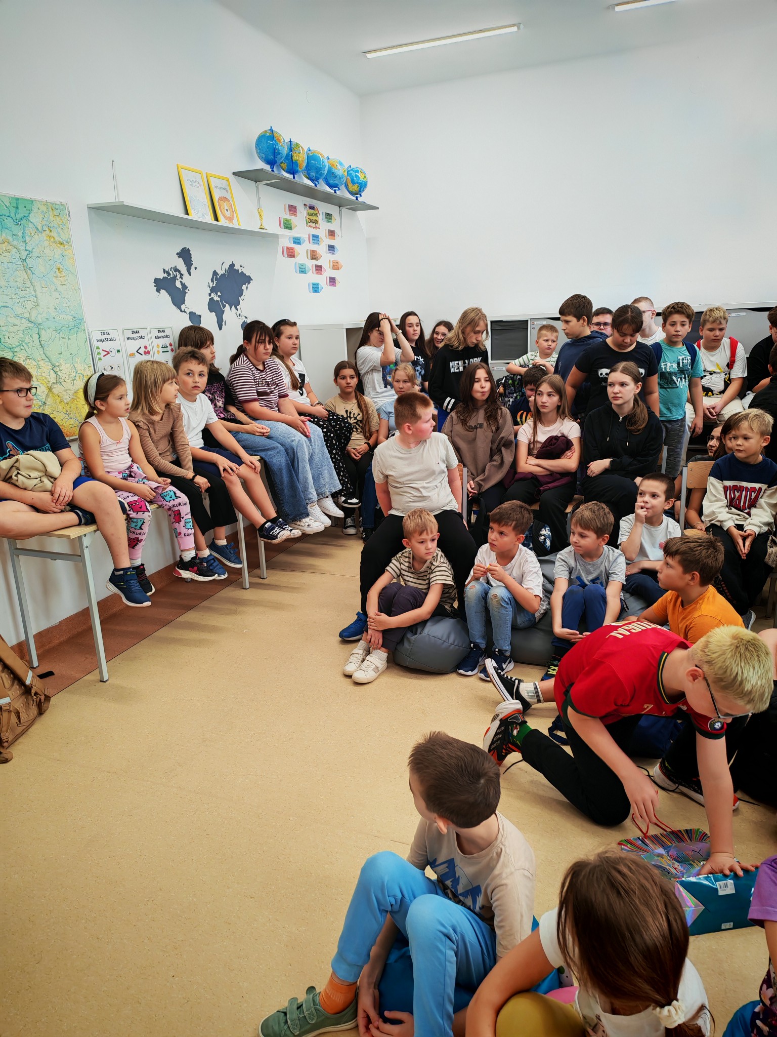 Uczniowie wzięli udział w pogadance na temat bezpiecznej drogi do szkoły. Funkcjonariusze przypomnieli zasady prawidłowego poruszania się po ulicy, dbania o bezpieczeństwo w drodze do szkoły i ze szkoły, a także bezpiecznego korzystania z hulajnóg.