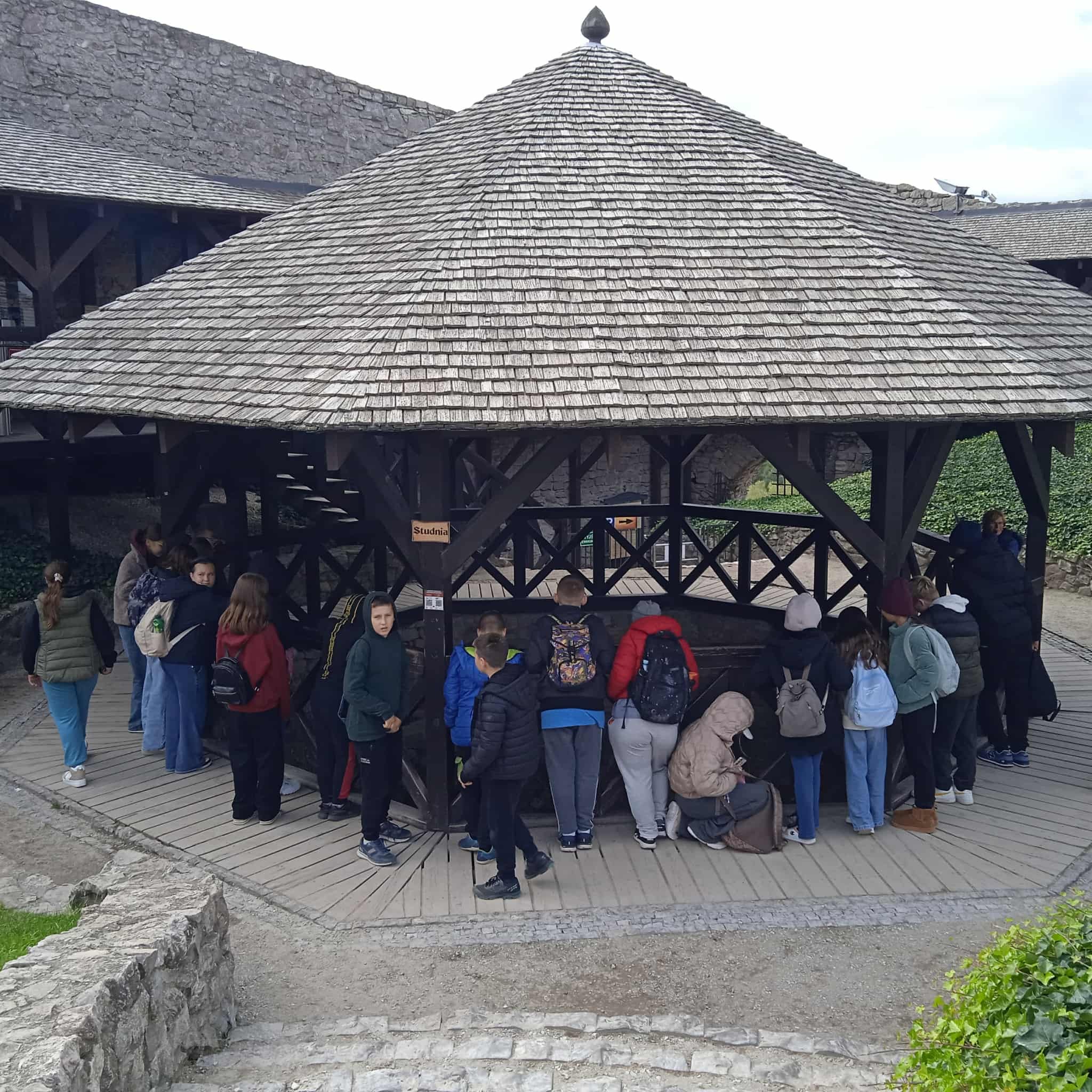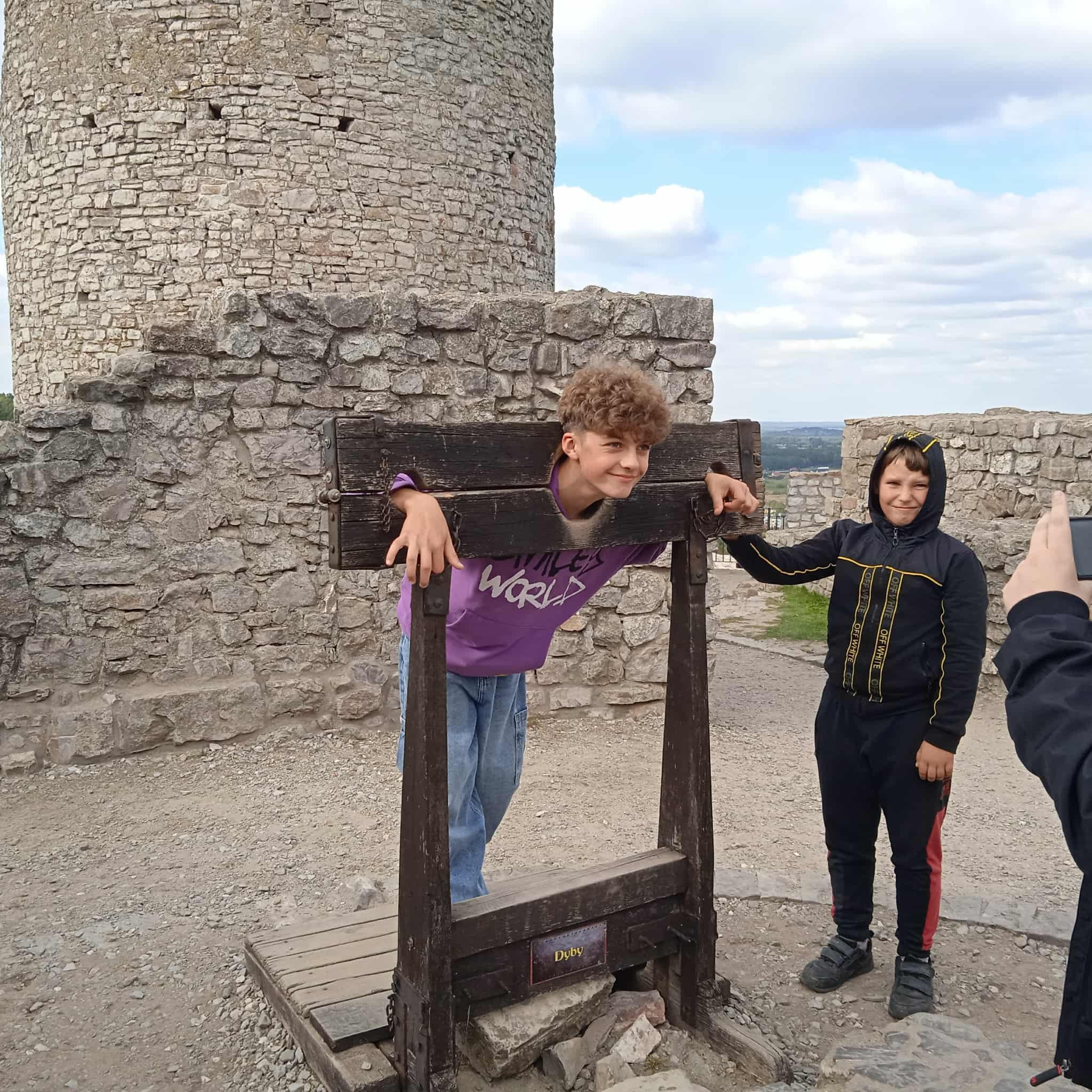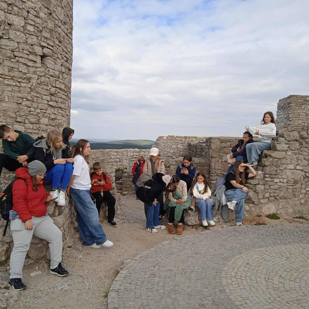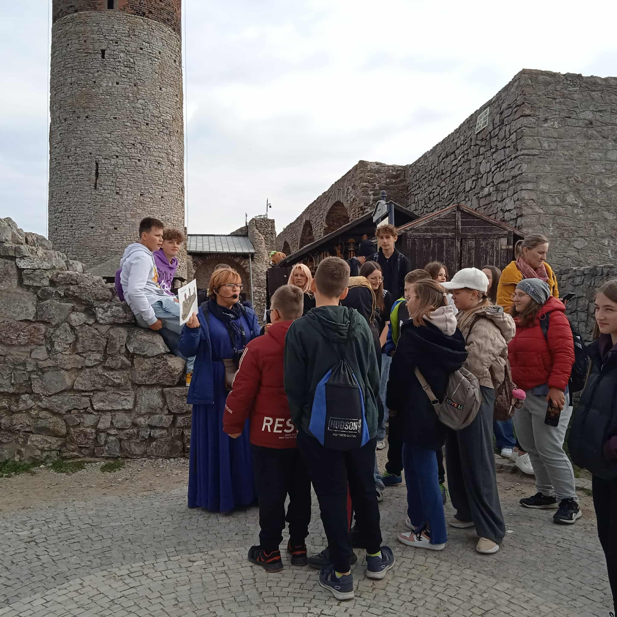Kolejnym punktem wycieczki była wizyta na Zamku Królewskim w Chęcinach. Pani przewodnik opowiedziała wiele interesujących historii i ciekawostek związanych z tym średniowiecznym obiektem. Dużą atrakcją okazało się również wejście na jedną z zamkowych baszt – wyzwanie to chętnie podjęli najodważniejsi uczestnicy.