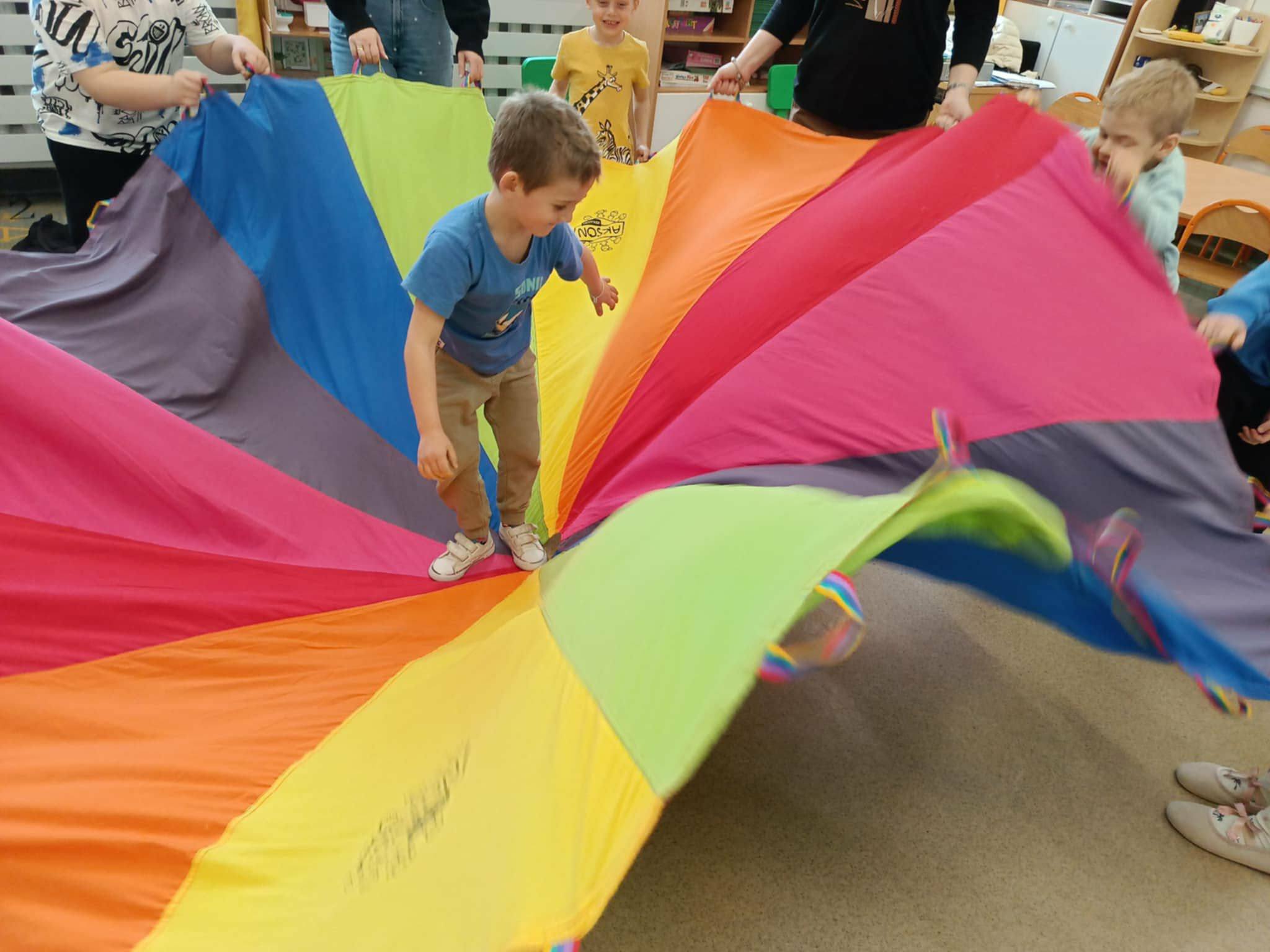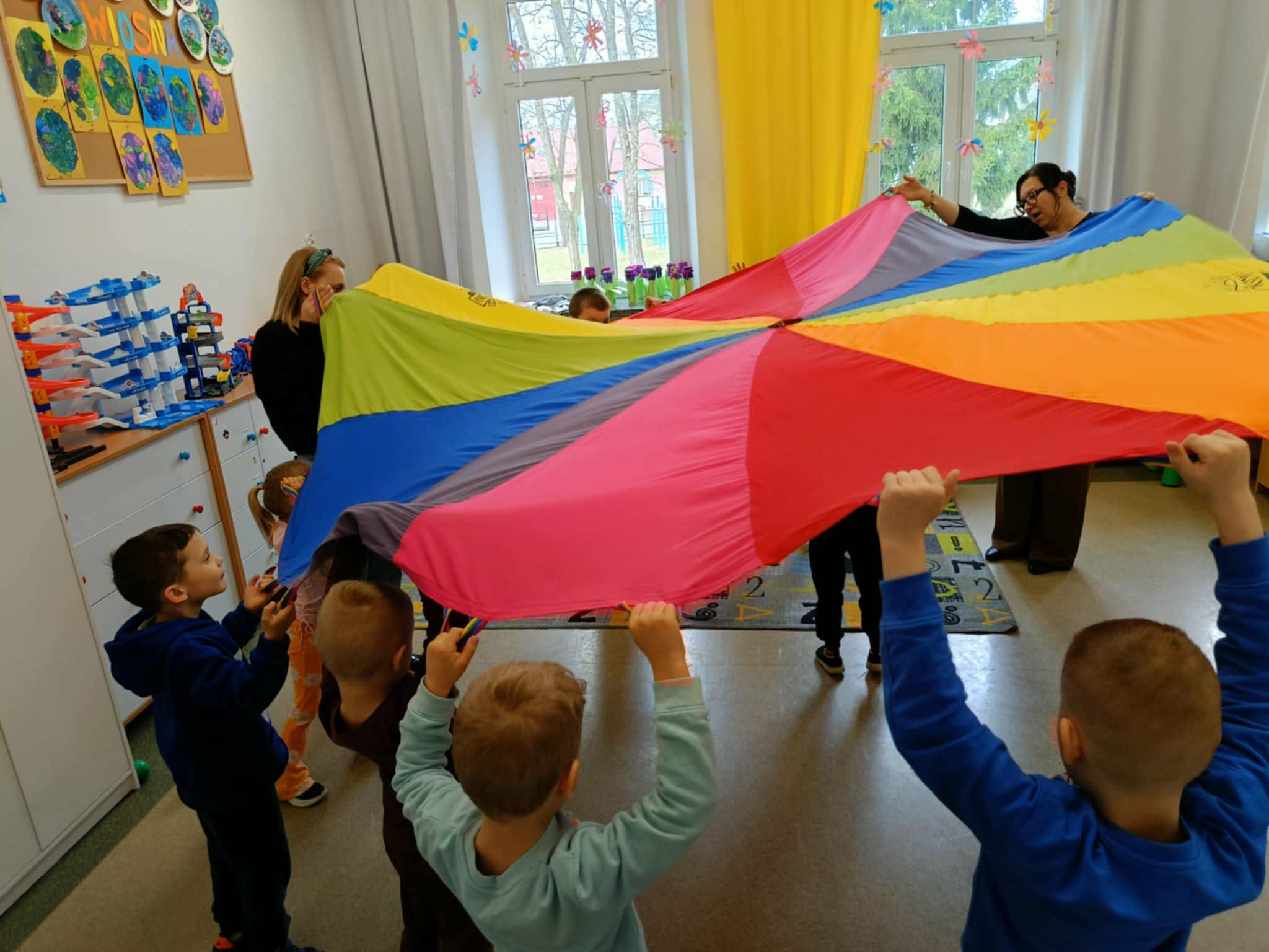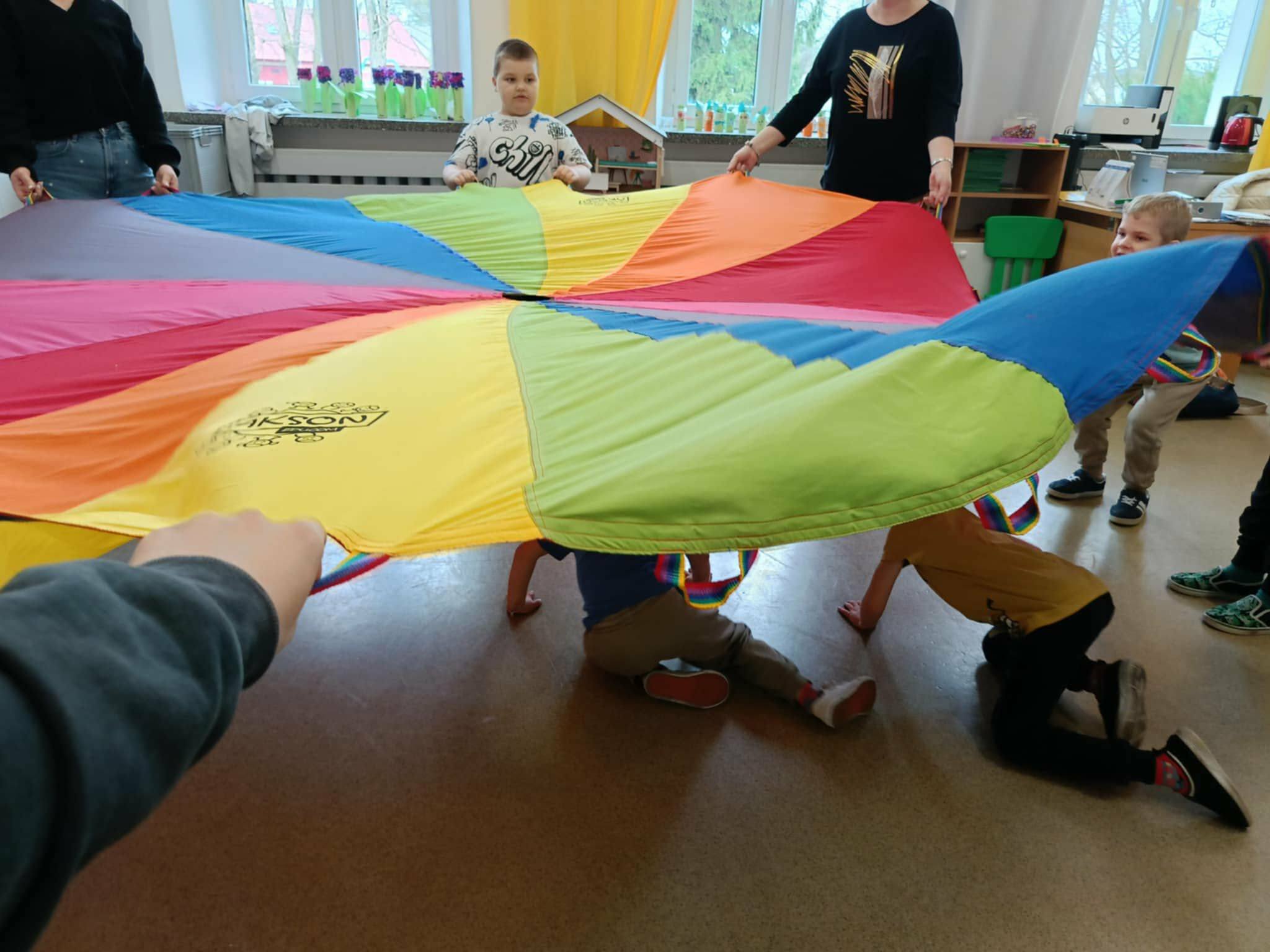 Po wysłuchaniu baśni dzieci wzięły udział w zabawach integracyjnych z wykorzystaniem chusty animacyjnej Klanza. Wspólnie bawiły się m.in. w „Rybaka i złotą rybkę”, „Calineczkę” oraz „Spadochron”. Aktywności te sprzyjały integracji grupy, rozwijały wyobraźnię oraz koordynację ruchową.