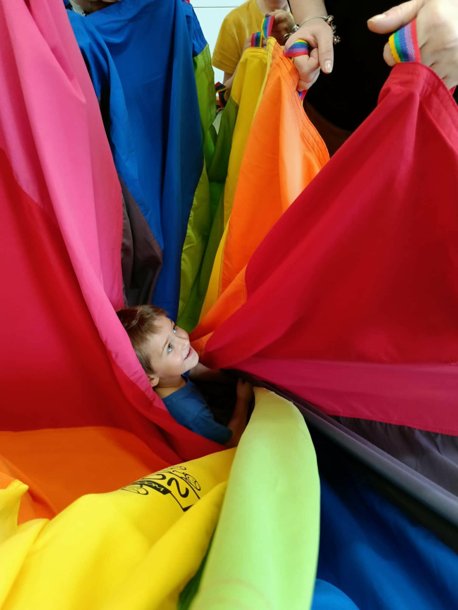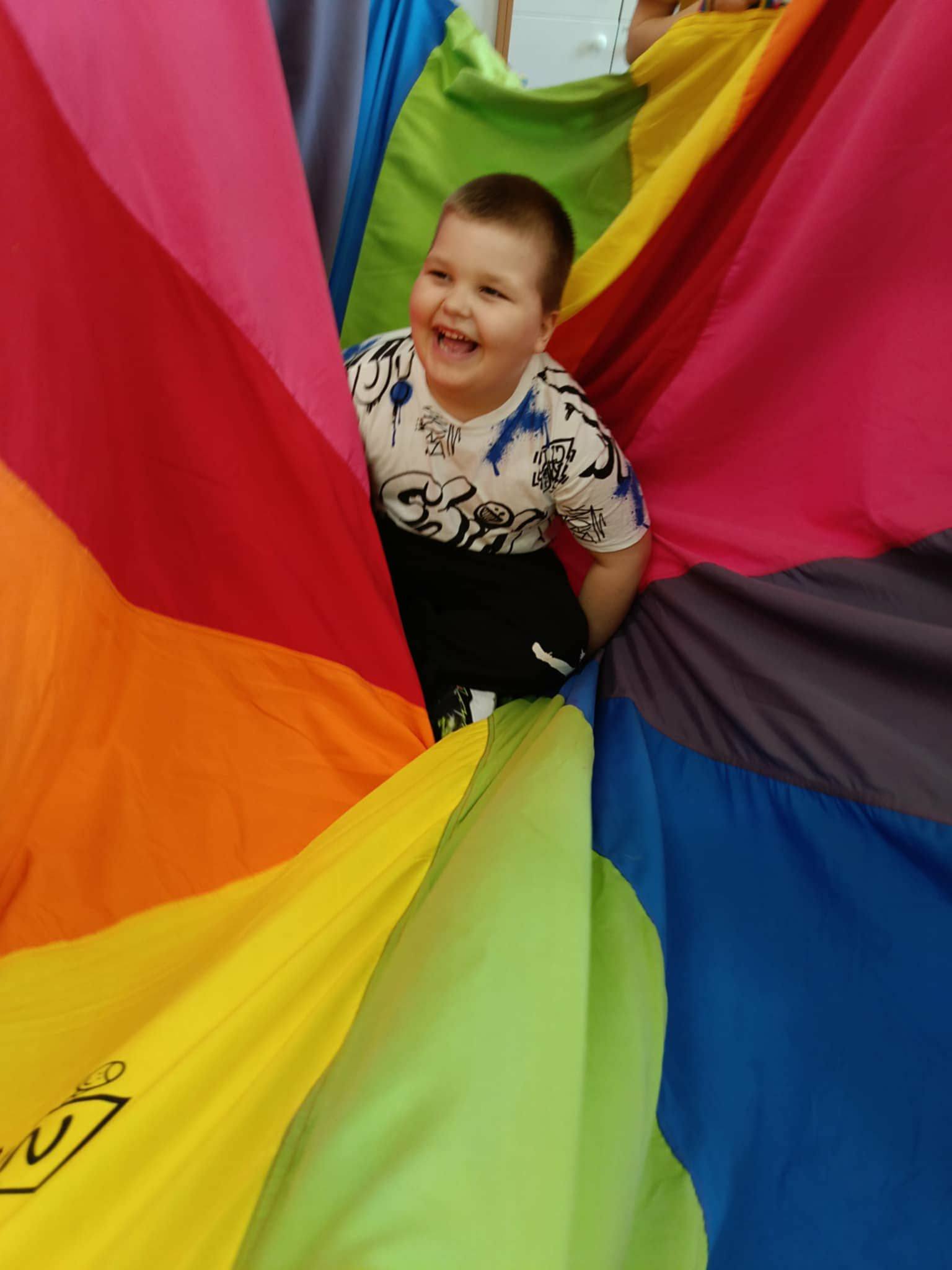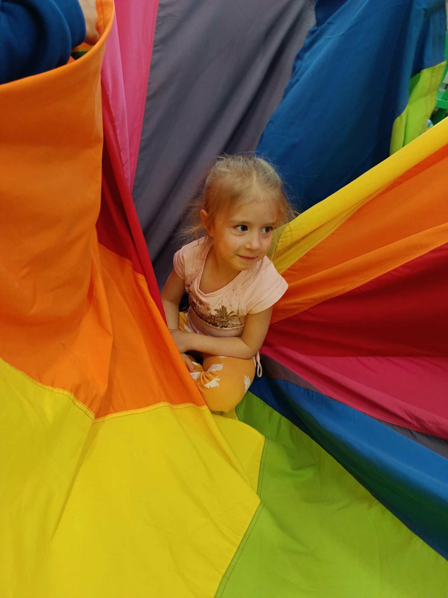 Po wysłuchaniu baśni dzieci wzięły udział w zabawach integracyjnych z wykorzystaniem chusty animacyjnej Klanza. Wspólnie bawiły się m.in. w „Rybaka i złotą rybkę”, „Calineczkę” oraz „Spadochron”. Aktywności te sprzyjały integracji grupy, rozwijały wyobraźnię oraz koordynację ruchową.
